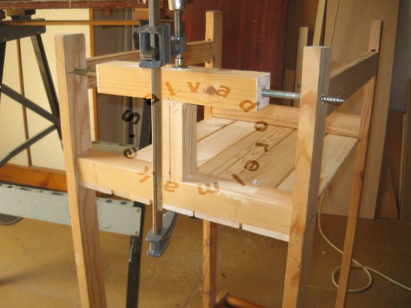Para unir los marcos entre sí he utilizado varias piezas de 30 cm de longitud y la separación entre ellas es la equivalente al grosor de las mismas, para conseguir la misma distancia se utiliza un recorte de una de las tablas. El montaje a uniones de media madera o con tubillones, yo he usado los dos sistemas: espiga y caja para los marcos y tubillones para el resto.