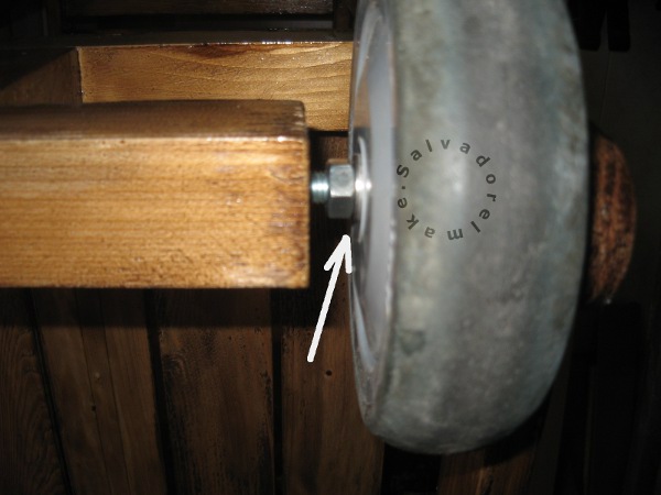Las ruedas son tema aparte, no recuerdo de donde proceden, andaban por algún cajón, como los marcos están hechos con las cuatro patas iguales solo tengo que marcar donde va el eje de las ruedas y después recortar un poco la pata afectada, de esta forma las 4 patas tienen la misma altura, las dos delanteras con rueda y las traseras apoyan directamente al suelo.