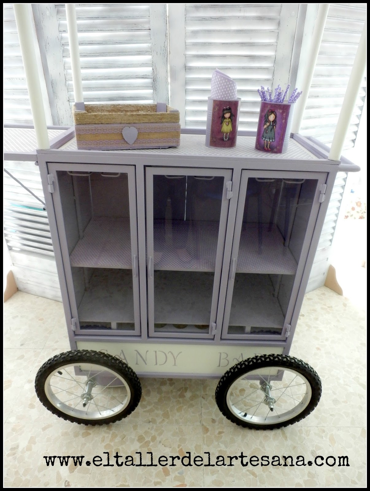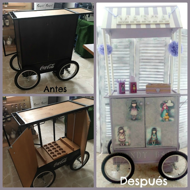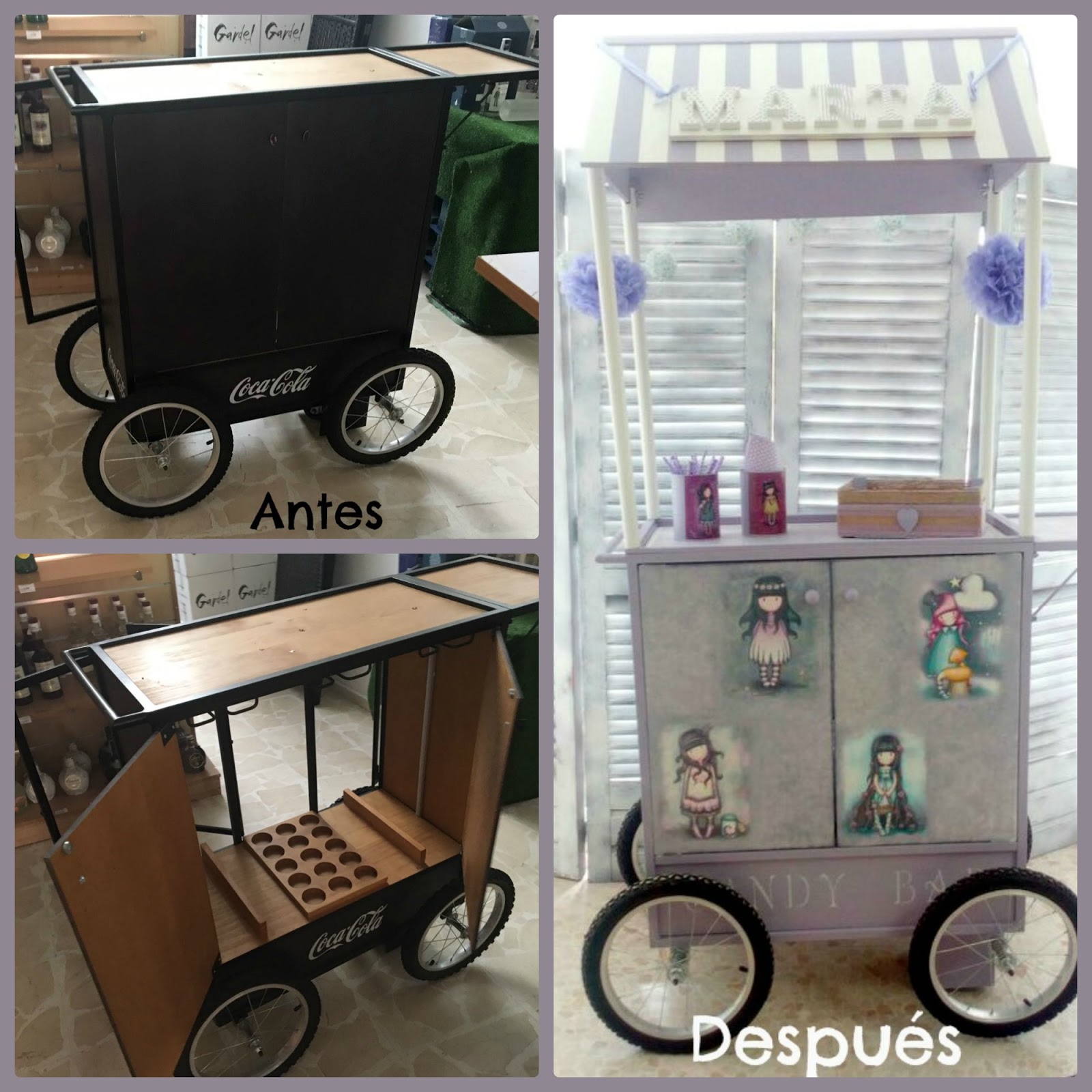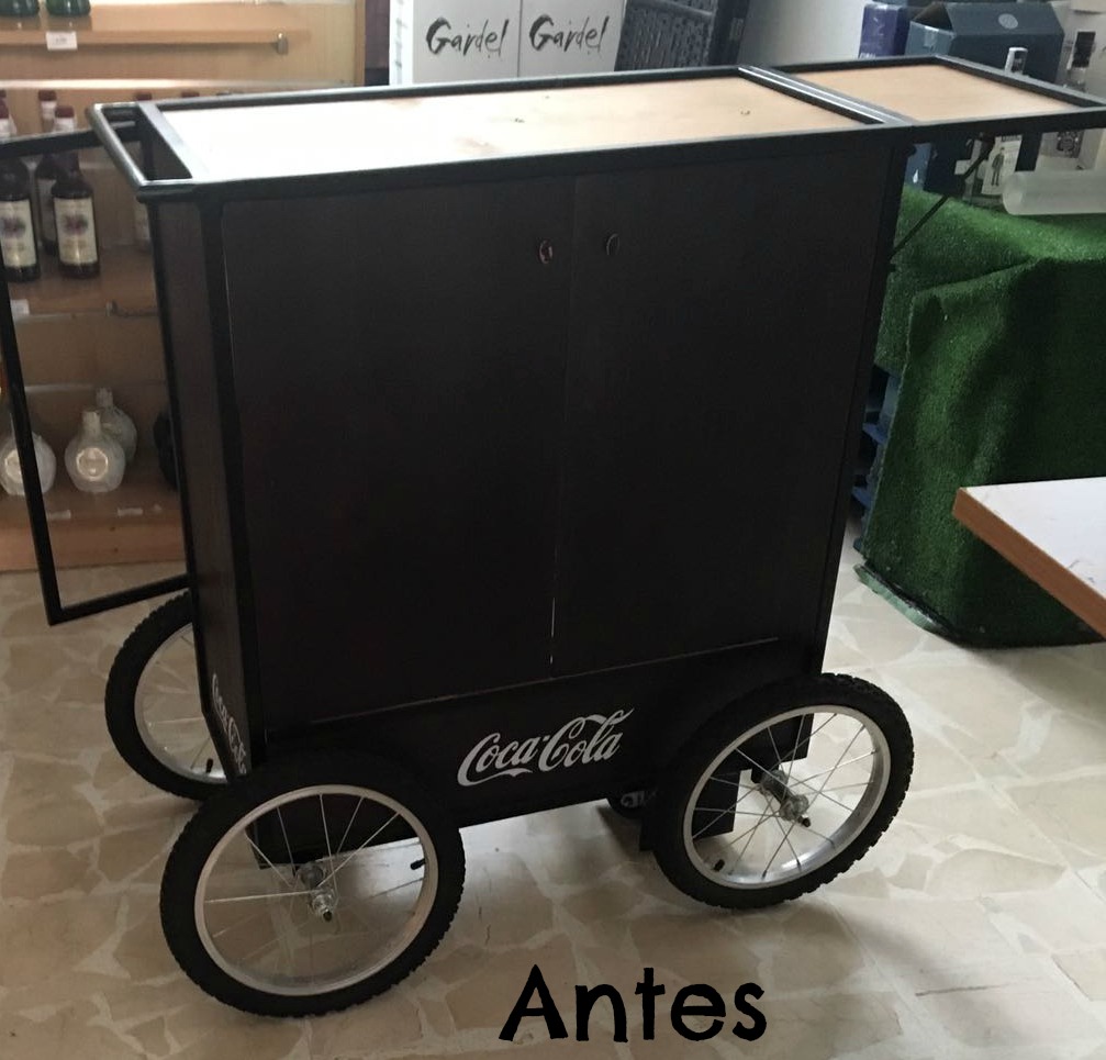 Como aparte de los muebles y complementos de decoración también estoy haciendo cositas para decoración de eventos sobre todo bodas y comuniones, el trabajo que hoy os quiero enseñar es muy especial. Se trata de la transformación de un carro de bebidas en un carro dulce para una comunión. Nos ha dado mucho trabajo ya que además de la decoración también teníamos que hacerle la estructura del tejado para que pareciera un carrito dulce de verdad. Os enseño como era antes cuando nos lo trajo el cliente.