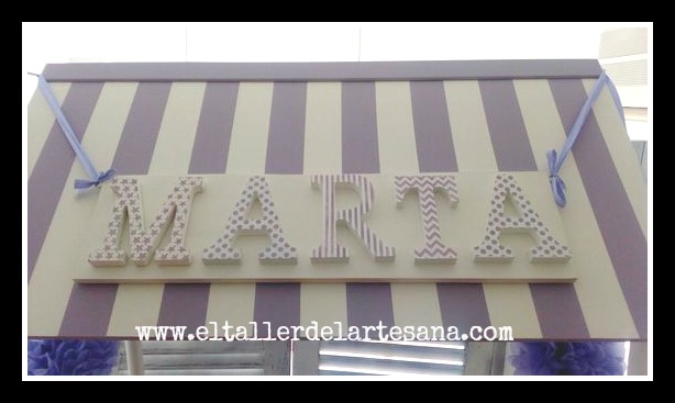 El tejado que hicimos desde cero, se decoró con rayas y con el nombre de la niña con letras de madera para que pudiera luego colocarlo en su habitación.