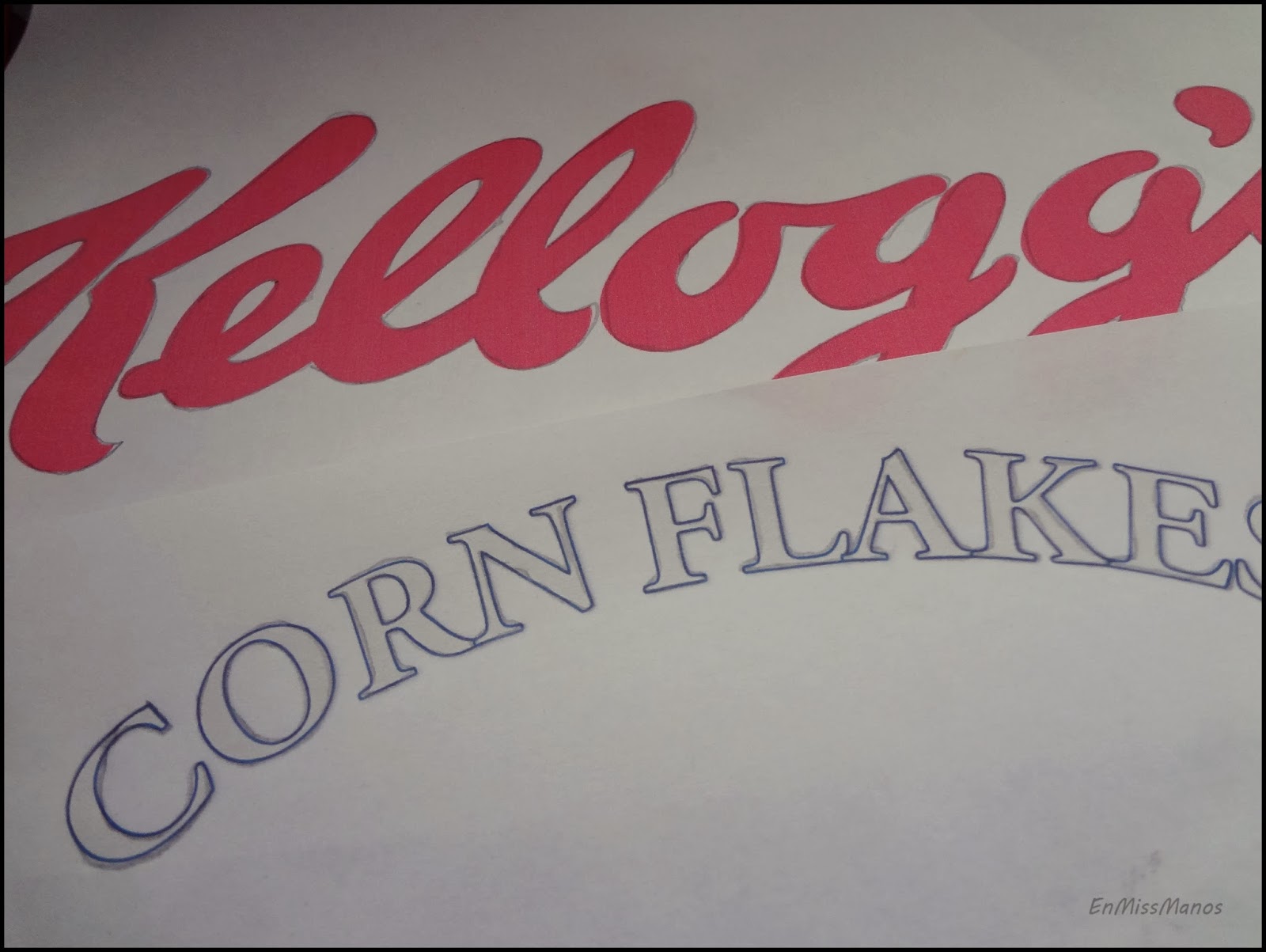 La composición para hacer las letras la hice imprimiendo de internet el logo de Kelloggs's por un lado, luego las letras curvadas de Corns Flakes las hice yo con ordenador porque no las veía por otro lado parecidas, y lo de Original lo dibujé a mano.