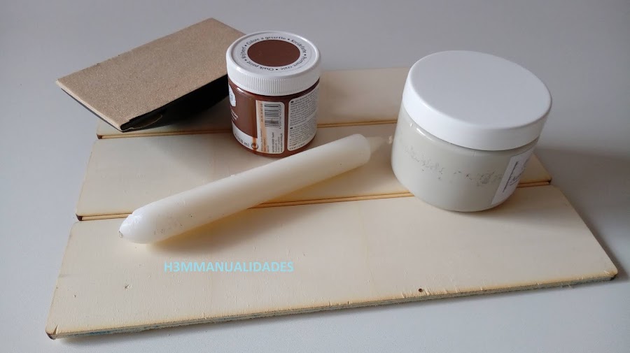 Aquí, el material que necesitaba: una tabla ya precortada imitando tablones, lija, vela, pintura a la tiza y cola para decoupage (además del protagonista: el papel de arroz)