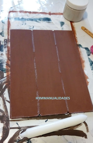 En muchos casos ya sabrás en qué consiste su elaboración, pero por si es la primera vez que pasas por aquí, te explico: una vez lijada la madera, la pinté con color marrón y pasé una vela por los bordes y por las zonas que imitan la unión entre tablas. De esta forma, cuando pintemos con un nuevo color sobre el de fondo, y pasemos una lija suavemente, la pintura saltará fácilmente en las zonas donde ha quedado la cera, dejando ver el marrón del fondo.