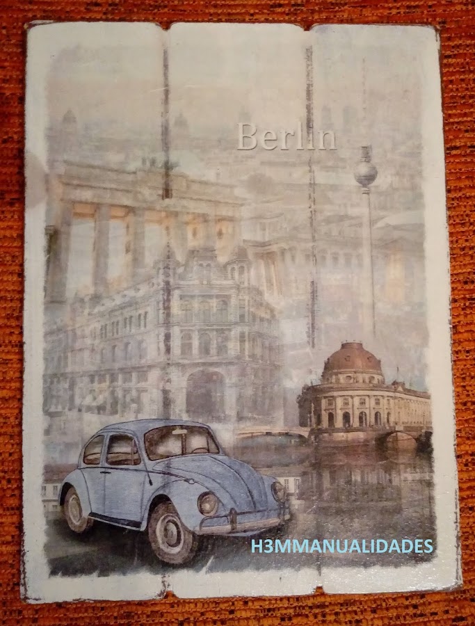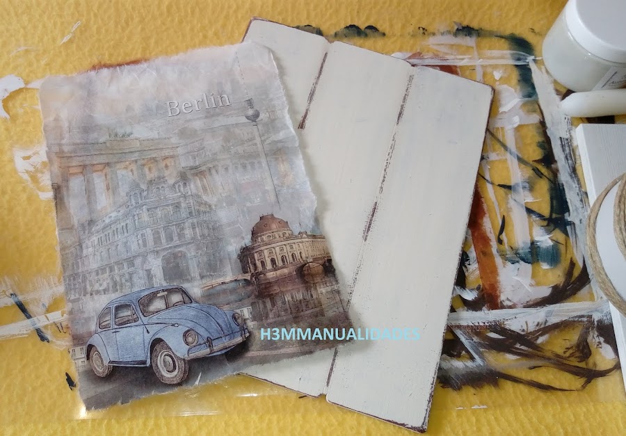 Sobre todo ello, aplicamos con decoupage el papel de arroz: damos cola en la base y ponemos encima el papel, apretando y extendiendo suavemente para eliminar arrugas y burbujas. Inicialmente pensé que igual tendría que hacer algo más para que se vieran las líneas de las tablas, pero el papel se transparentaba lo suficiente como para no tener que tocarlo. Para finalizar, un par de capas de barniz mate y ¡listo para lucirlo en la pared!
