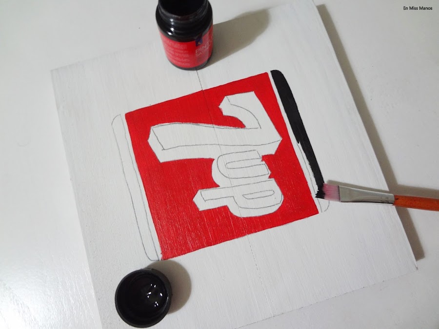 Como cada vez que pinto sobre una madera natural, doy una capa de imprimación, se dibuja el logotipo y ya comienzo a pintar con la pintura a base de látex, que es bastante cubriente para estos trabajos que requieren algo más de pulso y detalle.