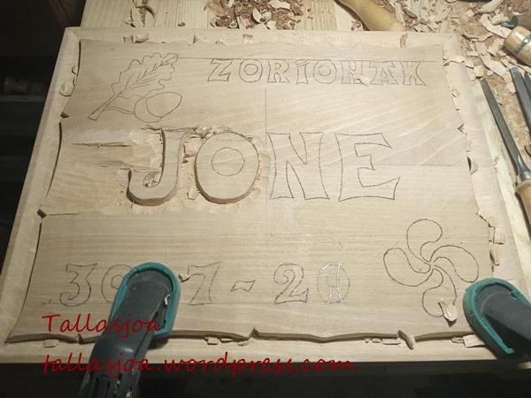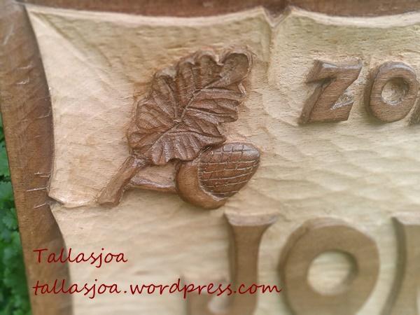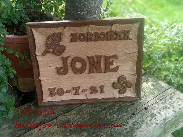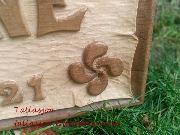 En las esquinas detalles emblemáticos vasos , el lauburu y una rama de roble con una bellota