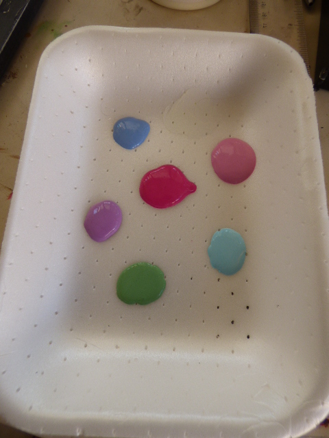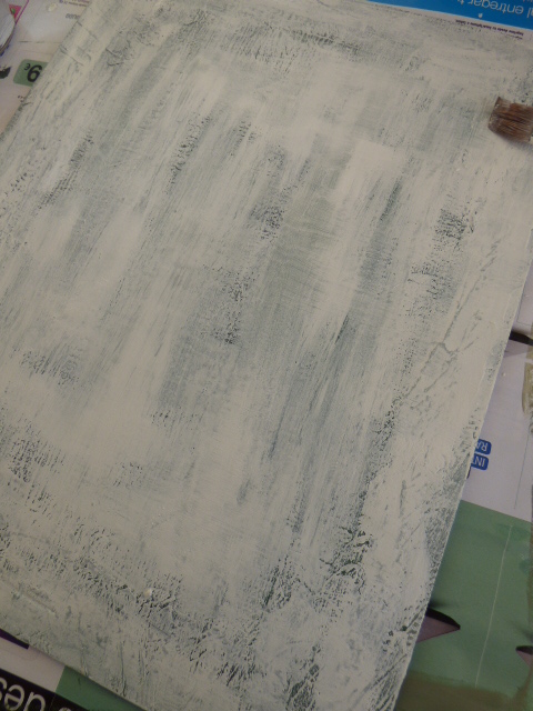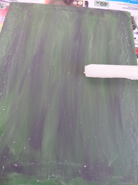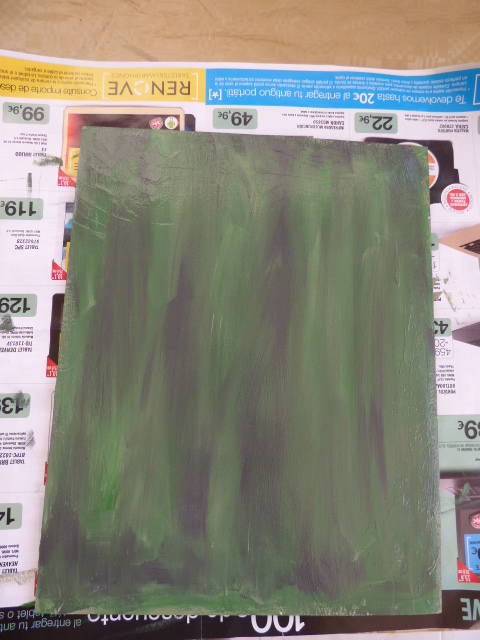 Primero y para utilizar botes de colores más intensos que tengo abiertos, hice un fondo con este verde intenso, mezclado con gris oscuro. Sin dejar que se seque un color, voy dando brochazos del otro, para que se mezclen bien