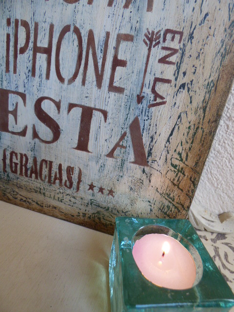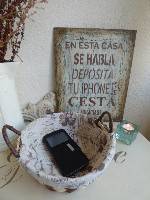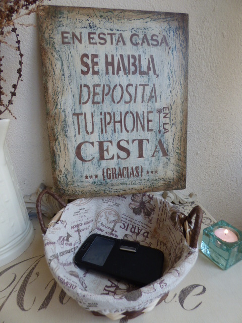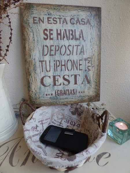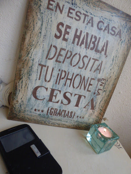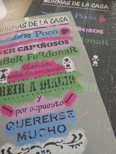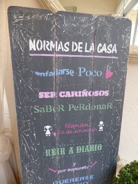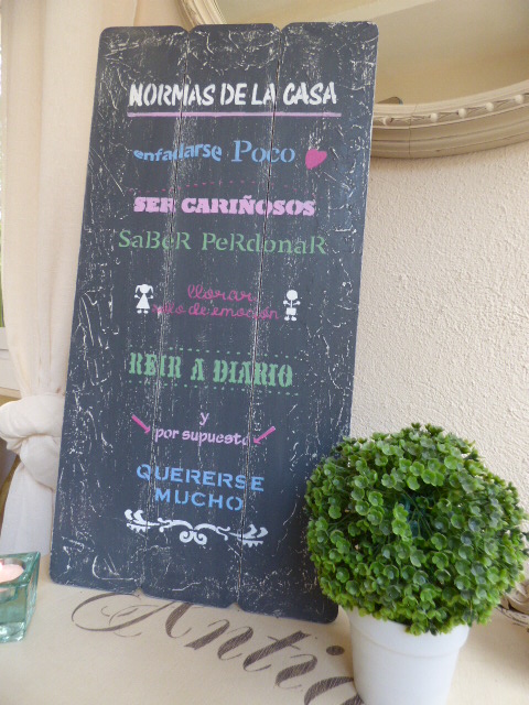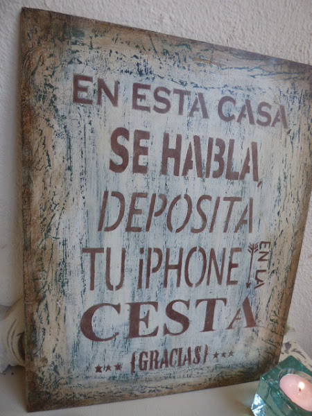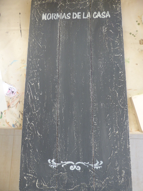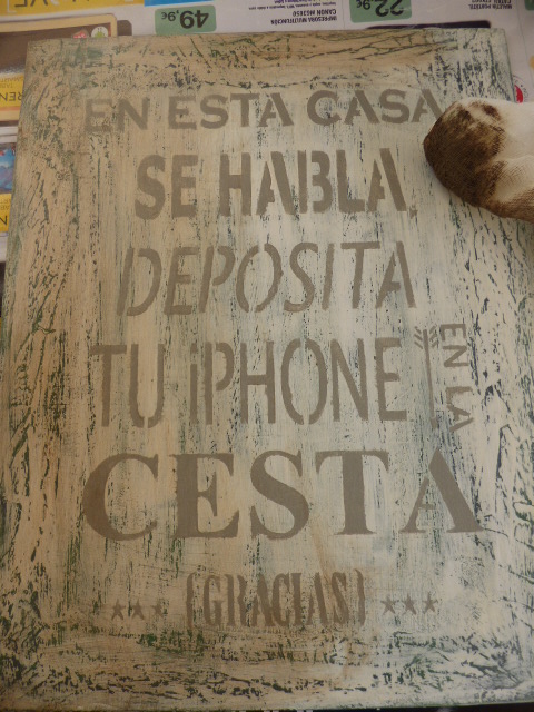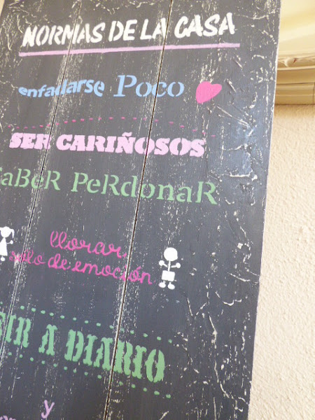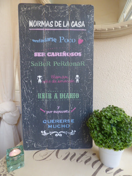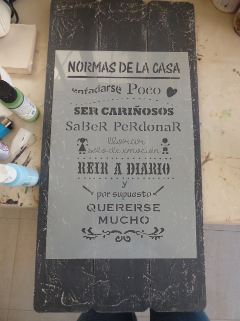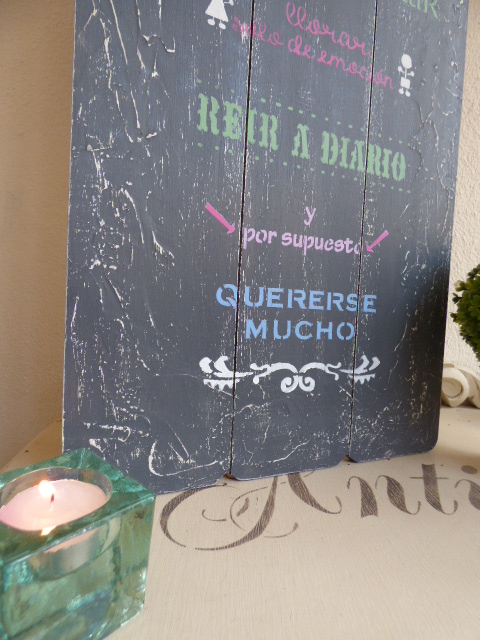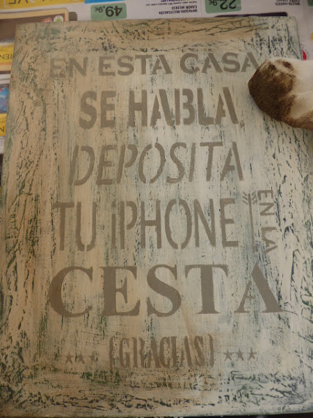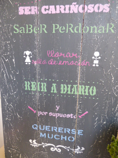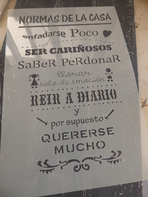 Después de darle la cera, lo dejé secar un rato y lo froté con un paño de algodón, retirando más, la cera de la zona central, que de los bordes de la tabla. Fué luego que aquí en casa me empezaron a decir que costaba leer el texto..... que el color del estarcido quedaba demasiado clarito....así que volví a poner la plantilla para estarcir de nuevo la plantilla con marrón oscuro. Así nos gustó mucho más.....yo siempre que acabo algo les pido opinión a mis 3 chicos...son mis más fieles fans y a la vez, mis más ferréos criticos jaja pero su opinión sincera, siempre se agradece....