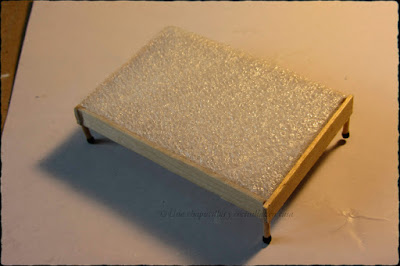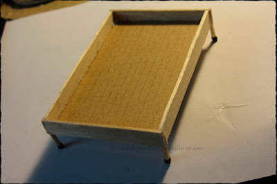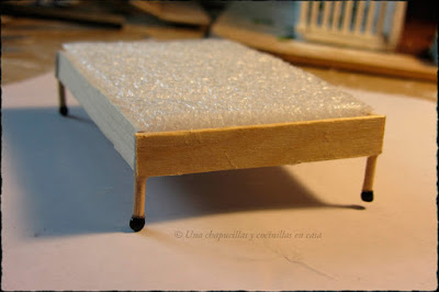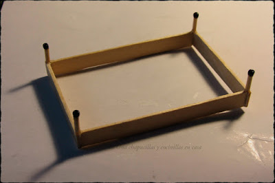 Bueno comienzo por la estructura de la cama, hecha con palitos de madera y las patas con mondadientes cortados. Las medidas son como las de una cama de 135x190 y bueno y que entrase entre las mesitas claro :-) para ello solo teneis que coger la medida real de cualquier objeto y dividirla entre la escala que esteis usando, en mi caso entre 24.