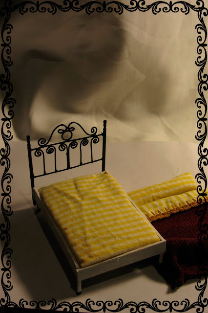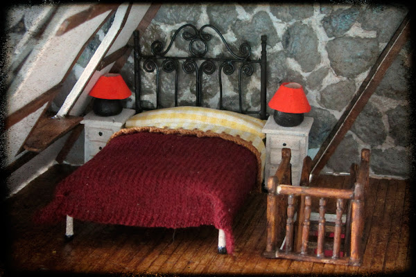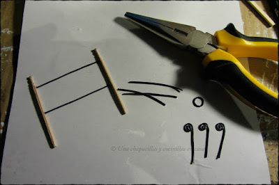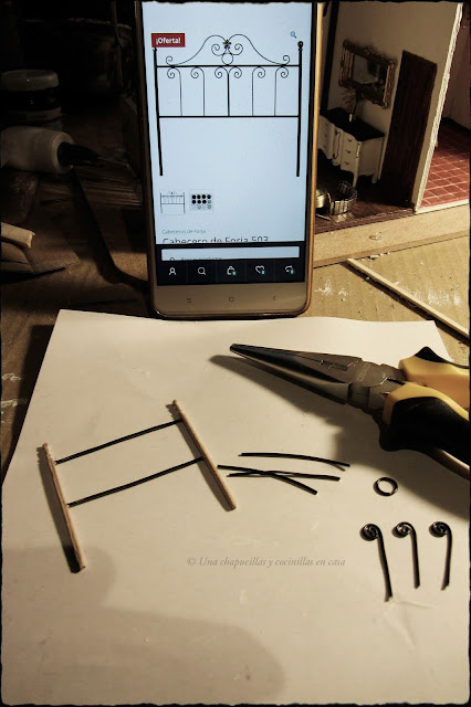 Para hacer el cabecero me guié de una imagen real de un cabecero de forja. Puse dos mondadientes torneados en los laterales y fui pegando con cola los trozos de alambre negro que iba formando con ayuda de unos alicates. Terminar pintando con acrílico negro los palillos y las zonas de la cola blanca para que no se vea.