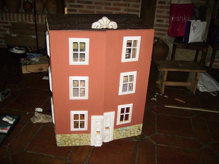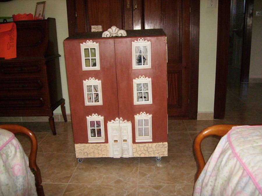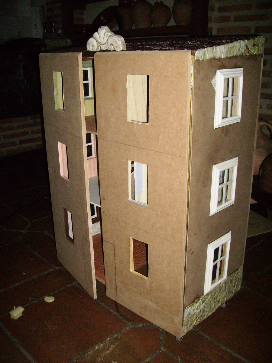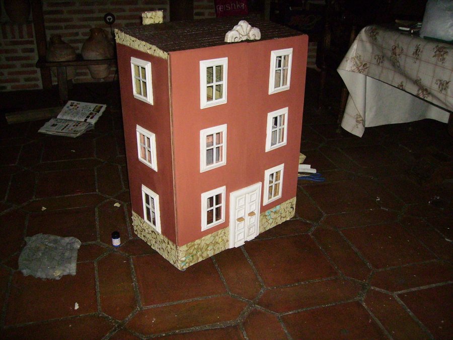 Las puertas de la fachada, puestas sin aun hacer los huecos de ventanas y puerta. Con una ingletadora de para madera corto los junquillos para construir los marcos de las ventanas. Algunos ingletes no me quedan bien, se ve en la foto que no quedan bien pegados, por lo que recurro al emplaste de serrín y cola. Como luego lo voy a pintar. Presentando una ventana, sobre el hueco de la fachada. Las ventanas pintadas de blanco, les pongo un junquillo y pongo un trozo de plástico rígido transparente a modo de cristal. La parte trasera de la casa, se pone el cableado, unido a un transformador de 12v, de un antiguo telefono. El tejado esta hecho con el papel ondulado de las galletas de chocolate cortado en trozos iguales simulando las tejas, después se pinta con pintura acrílica marrón y luego se le da cola de carpintero diluida en agua para endurecer las tejas. Para ocultar el cableado diseño una chimenea. Con dos junquillos y un trozo del dm. El zócalo lo voy haciendo con trozos del cartón de una huevera La fachada la pinto con pintura acrílica. El copete del tejado es un trozo reciclado de un mueble. Compro molduras de resina para decorar las ventanas, aquí en esta foto voy presentando como pueden quedar mejor.