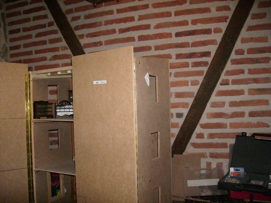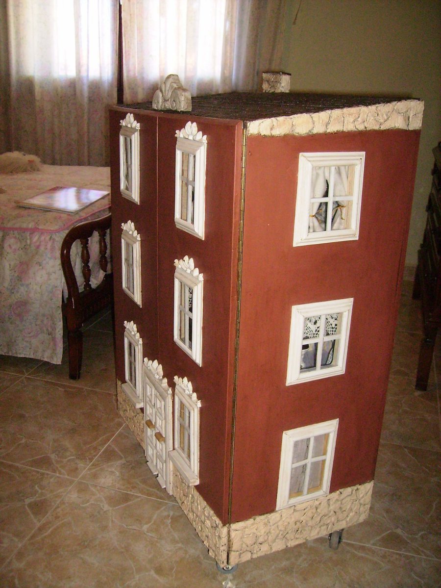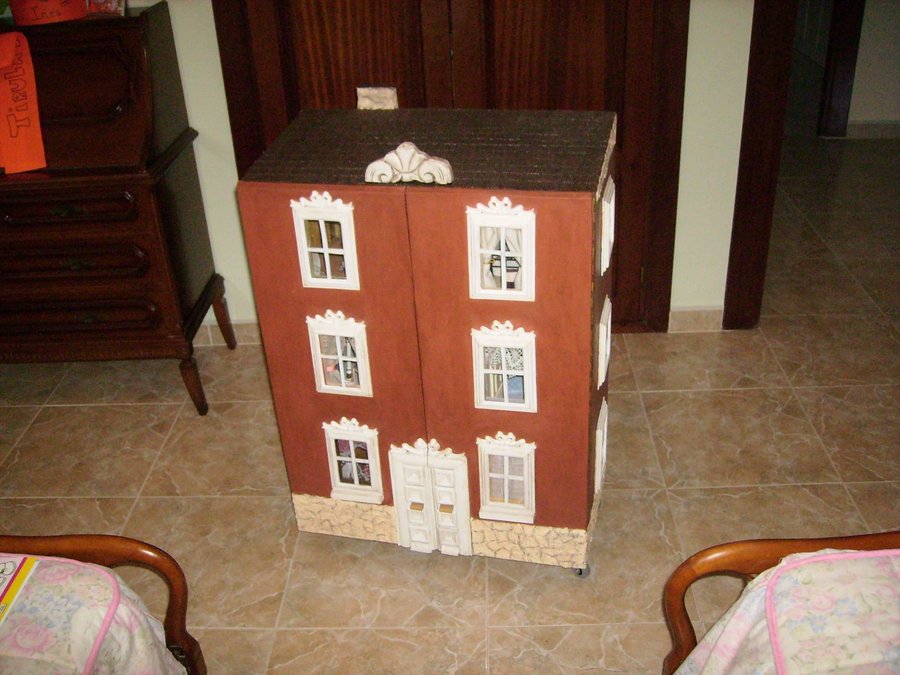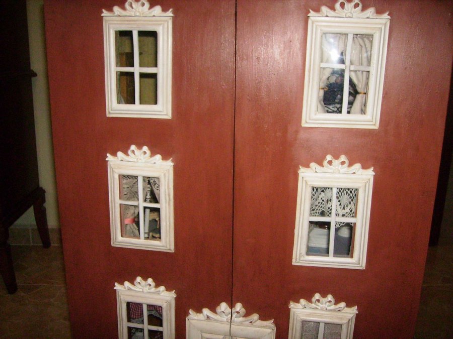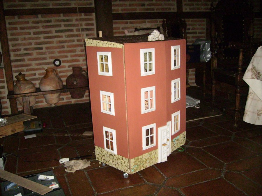 Las puertas de la fachada, puestas sin aun hacer los huecos de ventanas y puerta. Con una ingletadora de para madera corto los junquillos para construir los marcos de las ventanas. Algunos ingletes no me quedan bien, se ve en la foto que no quedan bien pegados, por lo que recurro al emplaste de serrín y cola. Como luego lo voy a pintar. Presentando una ventana, sobre el hueco de la fachada. Las ventanas pintadas de blanco, les pongo un junquillo y pongo un trozo de plástico rígido transparente a modo de cristal. La parte trasera de la casa, se pone el cableado, unido a un transformador de 12v, de un antiguo telefono. El tejado esta hecho con el papel ondulado de las galletas de chocolate cortado en trozos iguales simulando las tejas, después se pinta con pintura acrílica marrón y luego se le da cola de carpintero diluida en agua para endurecer las tejas. Para ocultar el cableado diseño una chimenea. Con dos junquillos y un trozo del dm. El zócalo lo voy haciendo con trozos del cartón de una huevera La fachada la pinto con pintura acrílica. El copete del tejado es un trozo reciclado de un mueble. Compro molduras de resina para decorar las ventanas, aquí en esta foto voy presentando como pueden quedar mejor.