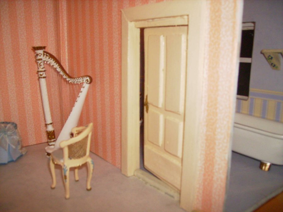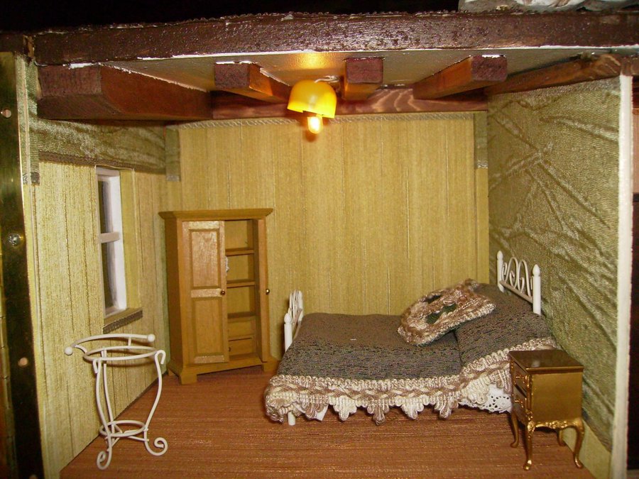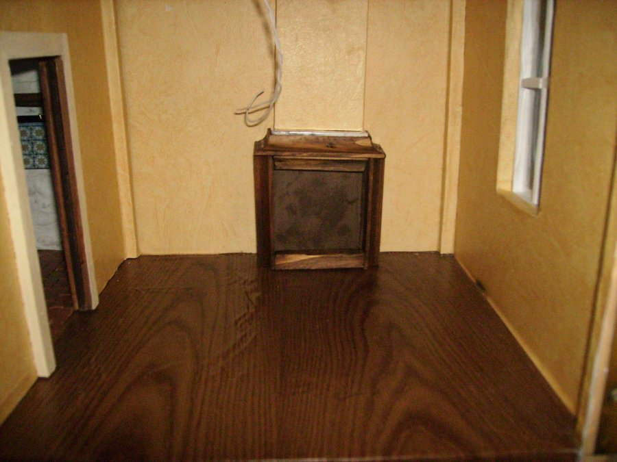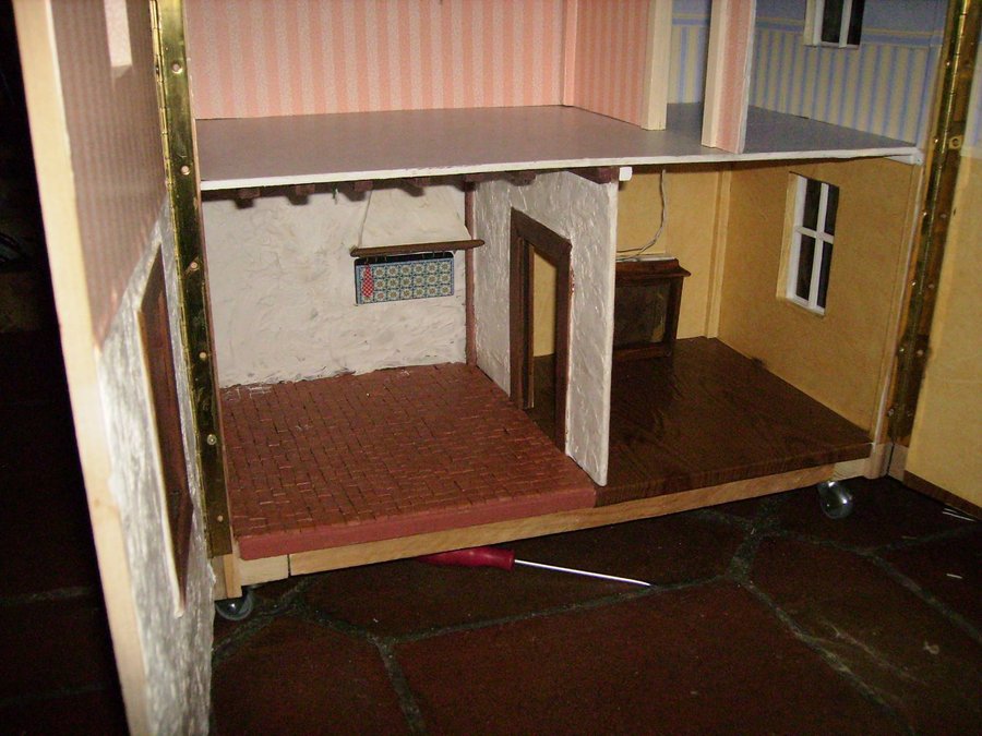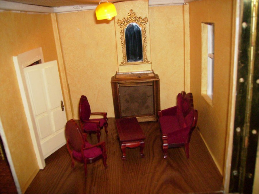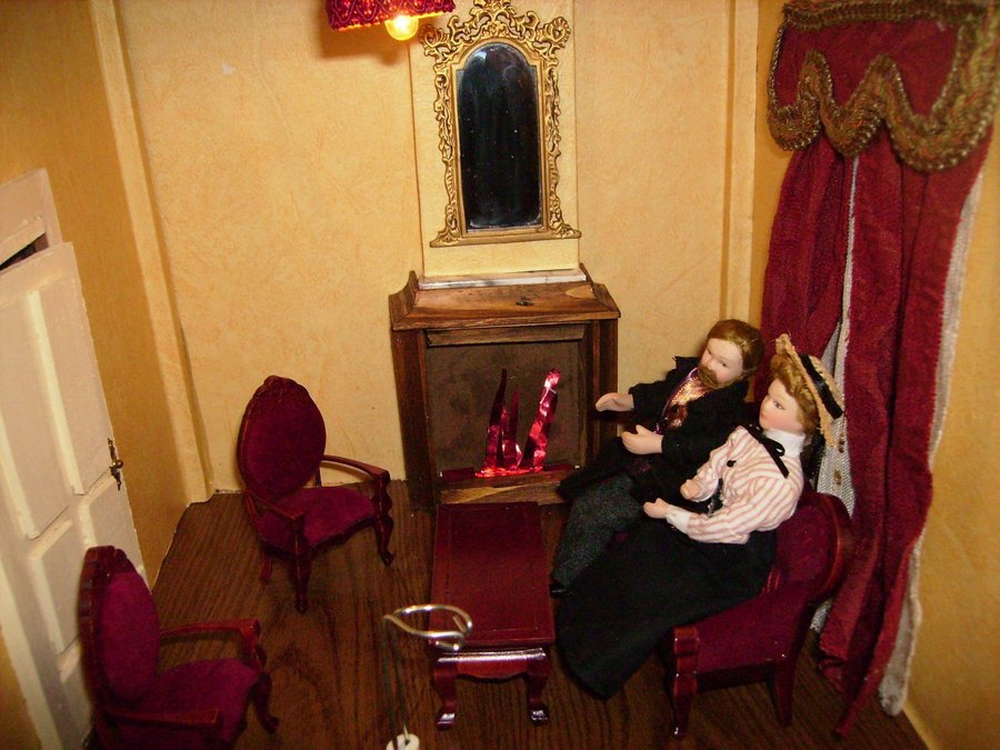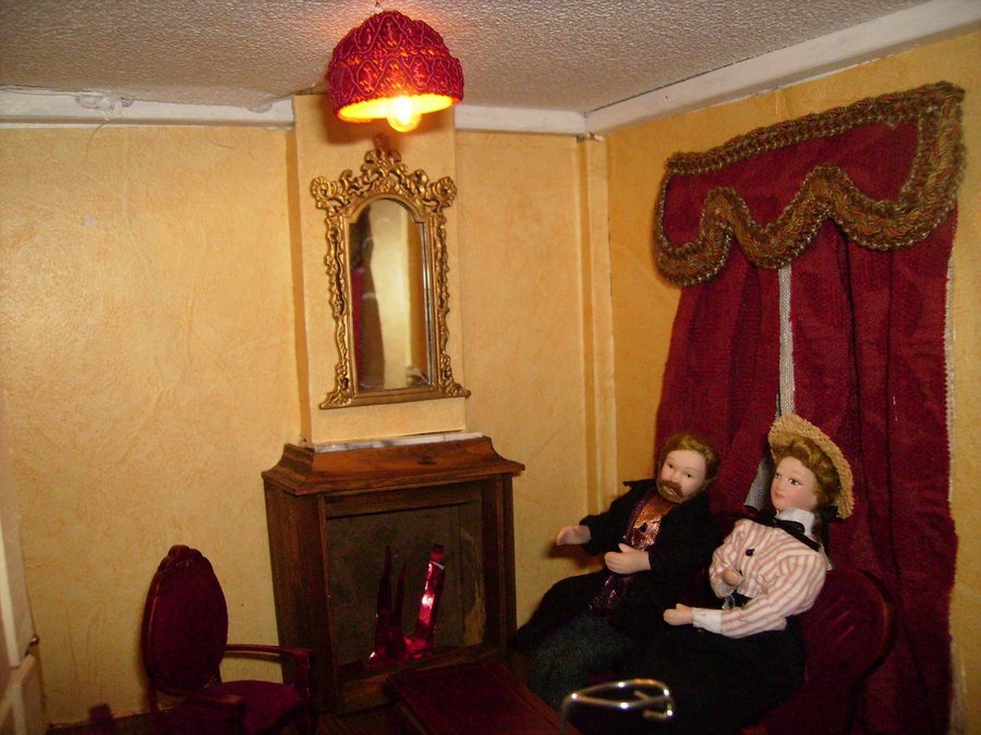 Esta es la foto del salón empapelado, y el suelo tiene un papel pegado que imita la madera. Al fondo se ve la chimenea con construyo con retales de maderas. Fotos del salón completado con las cortinas y muebles. La lampara es una media esfera de los huevos kinder. Aquí están los señores de la casa al calor del fuego. Foto general de la casa, aun la faltan muchos detalles.
