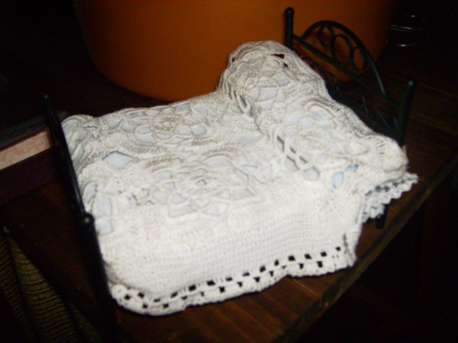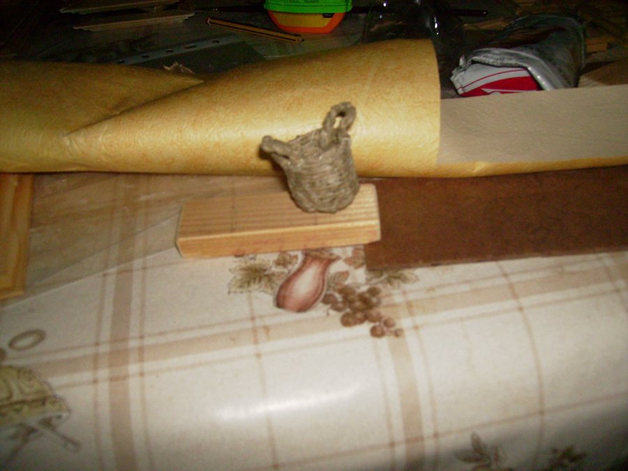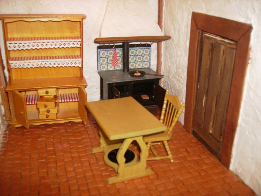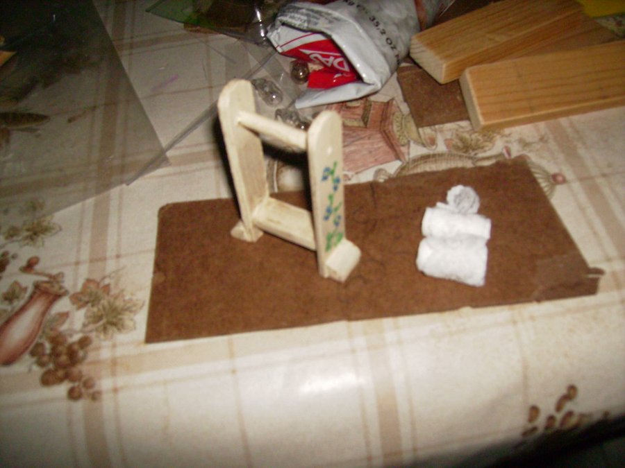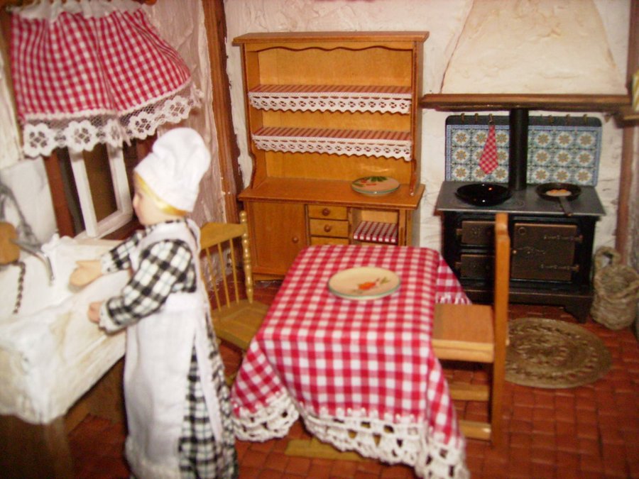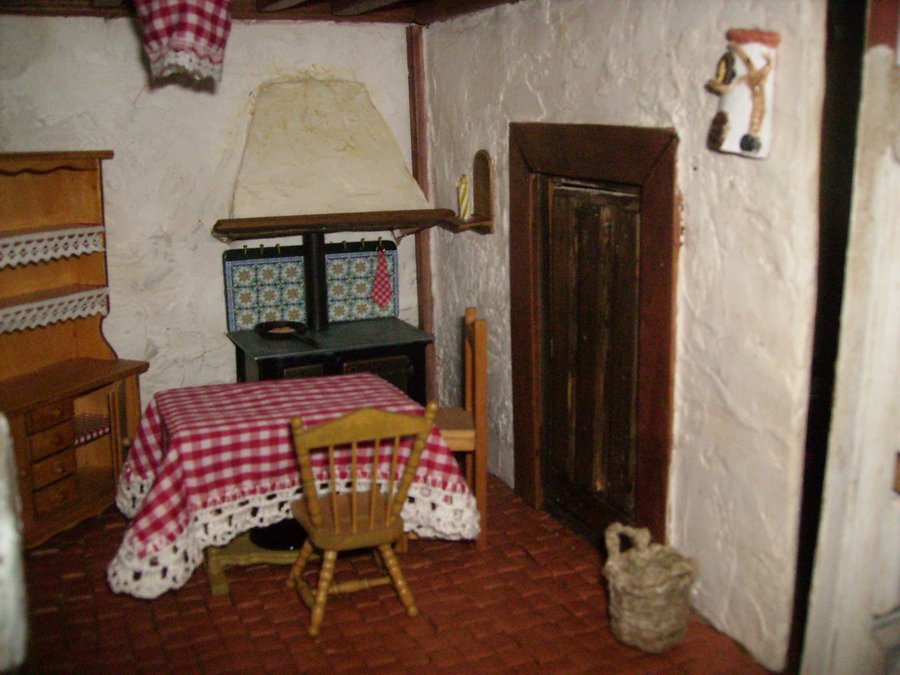 Las paredes de la cocina, están enfoscadas con aguaplas, cola y arena. La chimenea que se ve al fondo la hago con madera de dm y la enfosco con el acabado anterior. Imagen de las baldosas de la cocina construidas una a una para luego pegarlas en el suelo de la cocina. Detalle de la teja y una vela en la pared, Adornos que también hago a mano. Al igual que la puerta toda hecha a mano y se pueden abrir. Los manteles, cortinas, colchas, sabanas y demás confecciones las hicieron mi madre y mi abuela. Pensando en su nieta y bisnieta. Esta es la alfombra de la cocina que la hice con hilo de cáñamo. El cesto de la cocina también construido con hilo de cáñamo. En esta foto se ve donde quedan la alfombra y el cesto. El mantel que hizo mi abuela se aprecia como hace su puntilla con ganchillo. SALON.