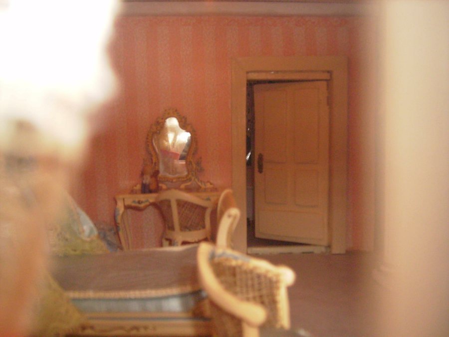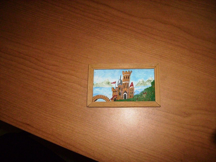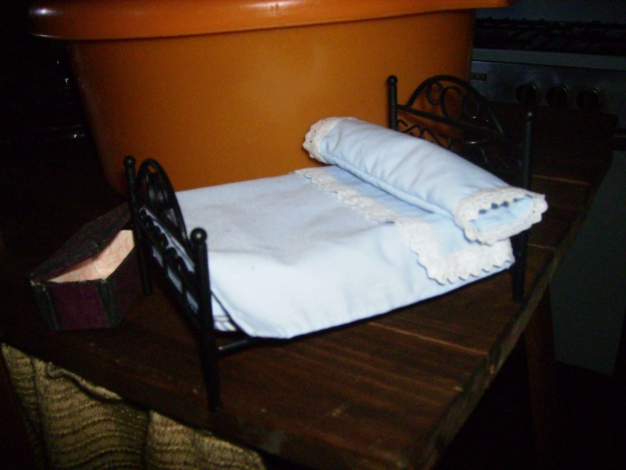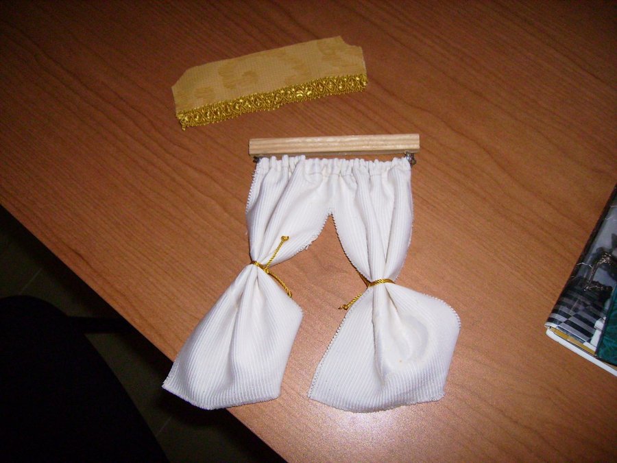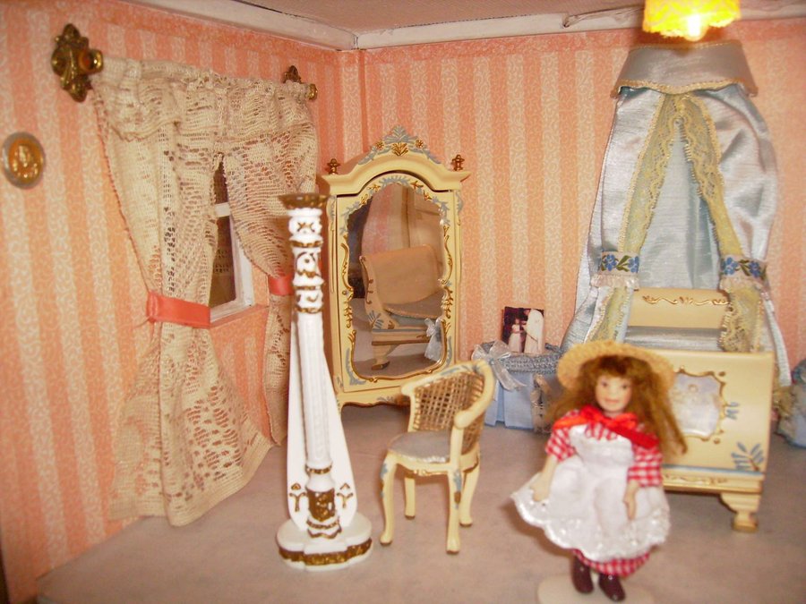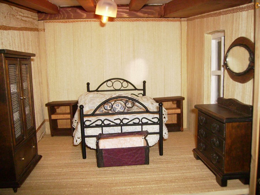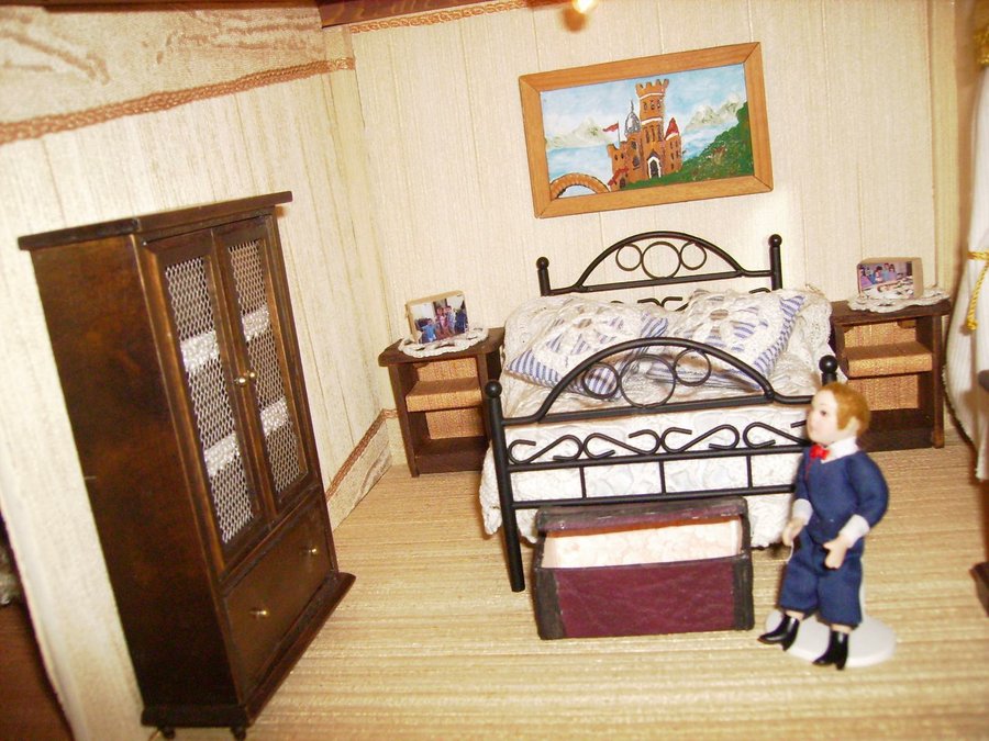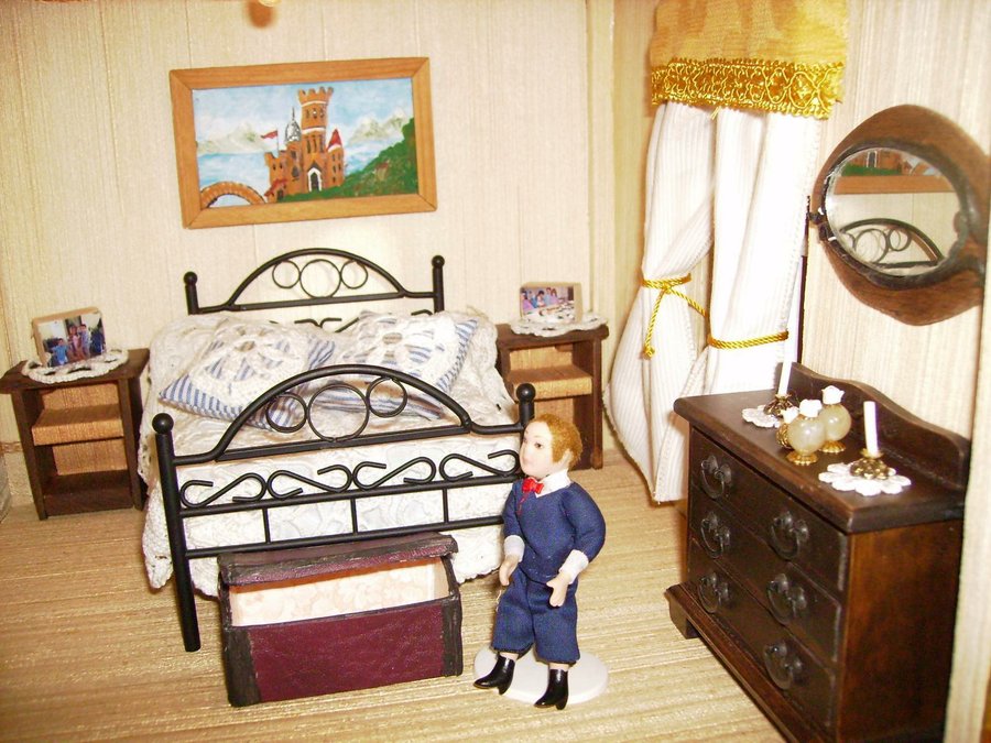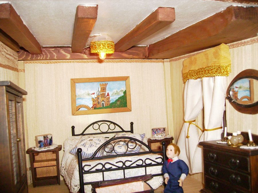 Las mesillas están hechas con maderas por mi. y el baúl también lo hice con cartón forrado por dentro con papel y por fuera con una tela que imita la piel. Esta es el juego de sabanas que hizo mi madre con su puntilla. La colcha la hizo mi abuela a ganchillo. Esta foto se ve muy gráficamente el sistema de cortinas. El cuadre le hice con maderitas y le pinté un cuadro a mano alzada con acrílicos. Fotos de la habitación del príncipe con todos sus detalles.