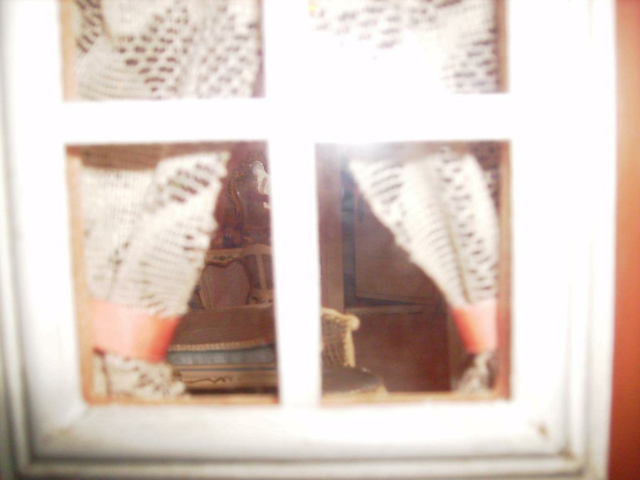 Detalle de como quedan las cortinas, estas hechas por mi madre. En las paredes hay colgados cuadros con fotos personales de la futura dueña de la casa, mi sobrina. Foto tomada desde el exterior del dormitorio rosa.