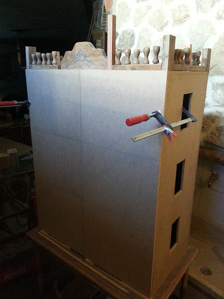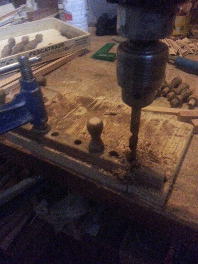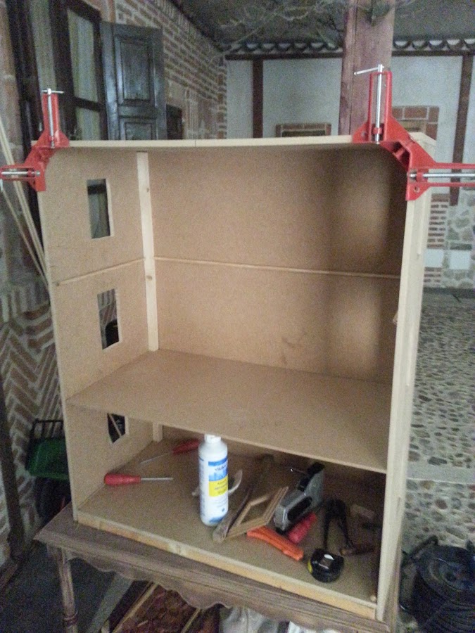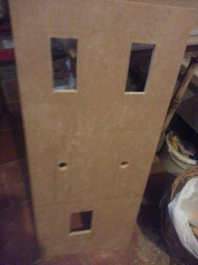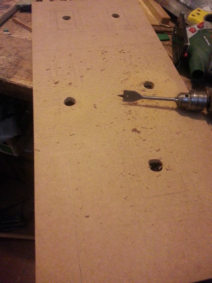 Utilizo madera de dm de 10 mm de grosor. En esta foto se ve con la broca de pala inicio los agujeros de las ventanas, que posteriormente cortaré con la sierra de calar.