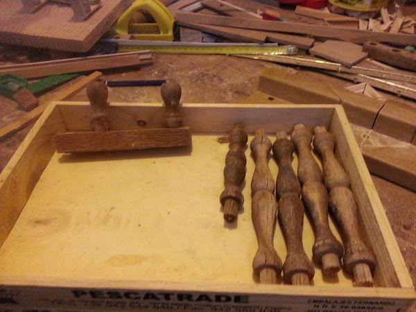 Esta es una parte importante del reciclado, nombre que compone mi página y mi blog, pues en númerosas ocasiones reciclo lo que cae en mis manos. Este caso unas partes de sillas de roble, voy sacando las piezas a las que luego daré otro uso.