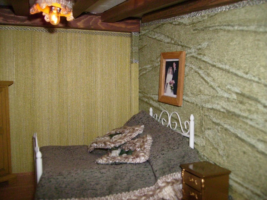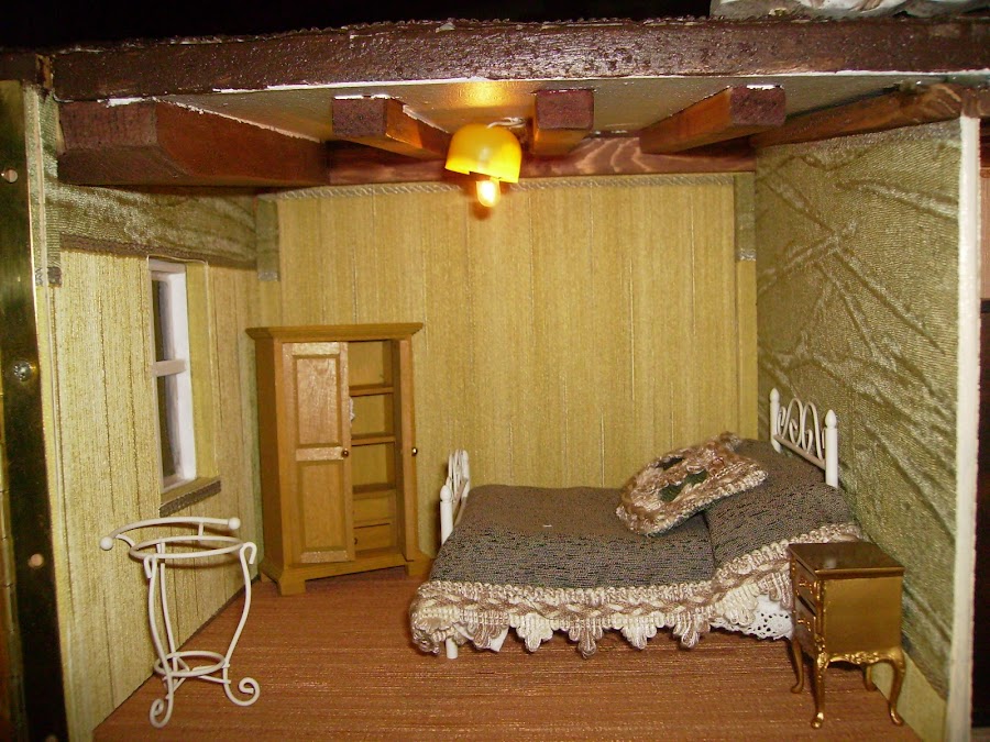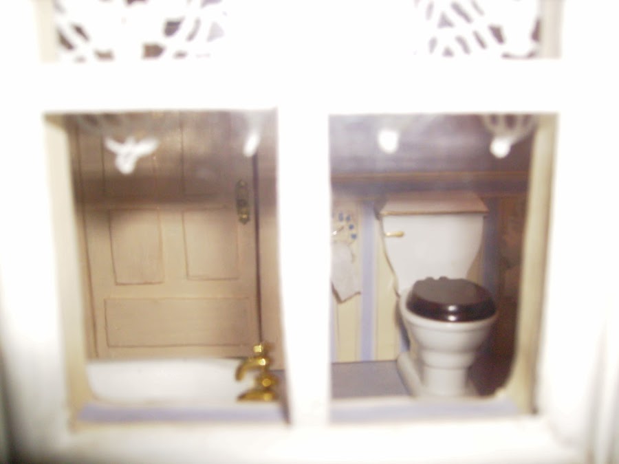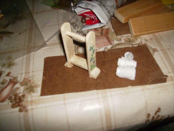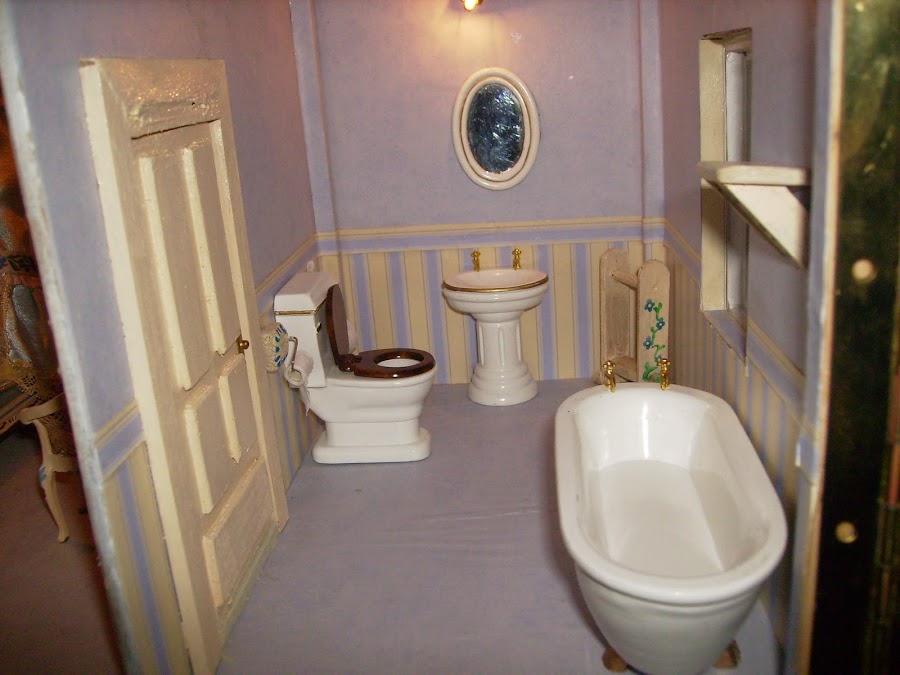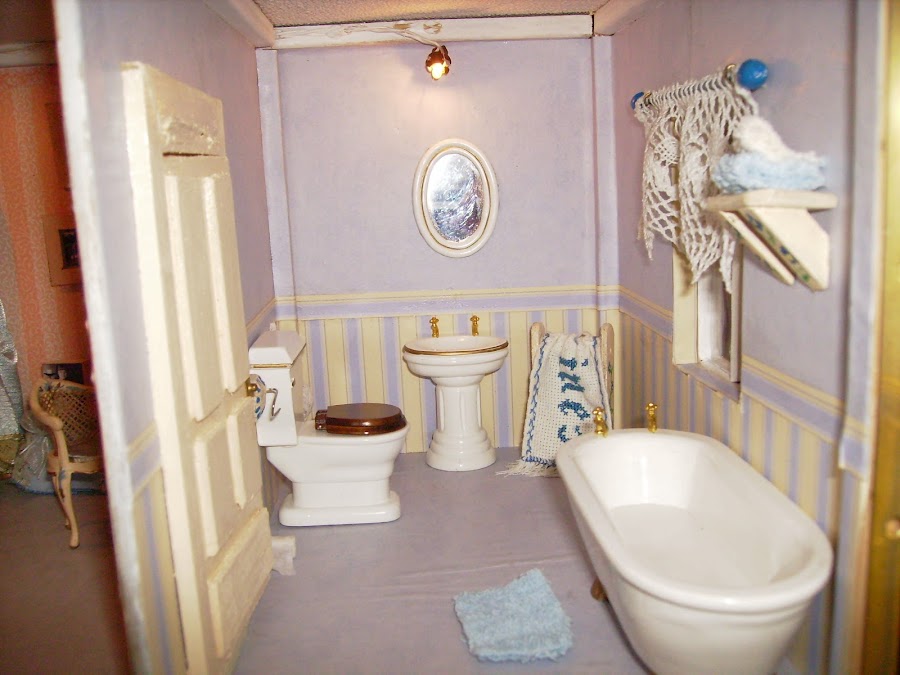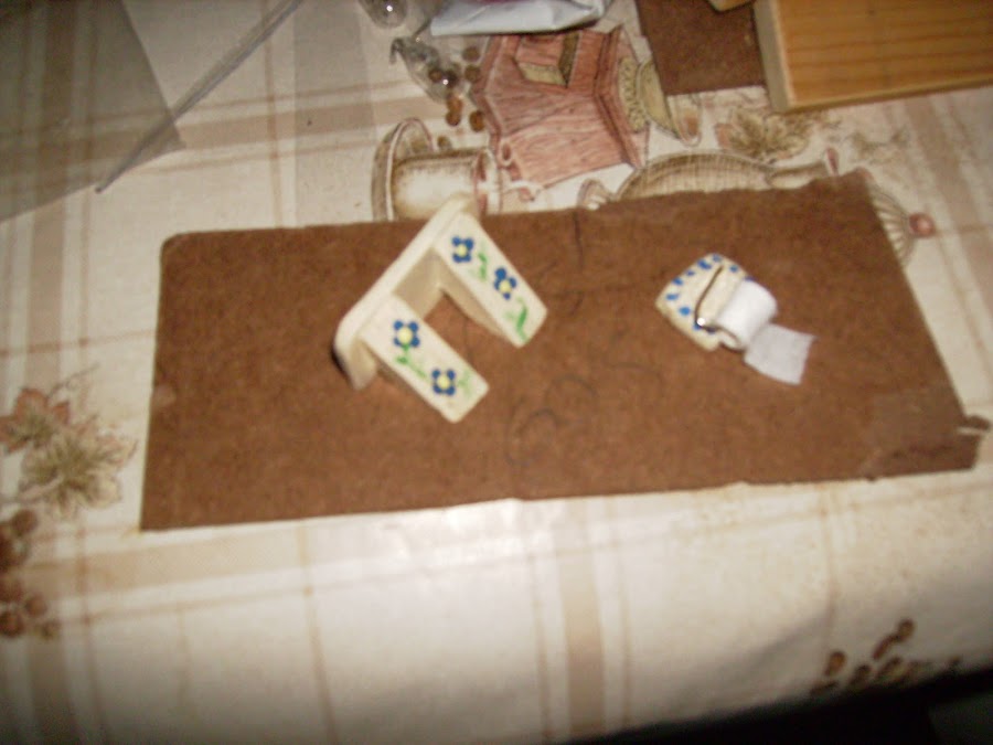 Los sanitarios del baño son comprados. Las paredes y suelos están empapelados. Detalle del colgador de papel higienico, el toallero y la repisa de encima de a bañera los construyo con maderas.