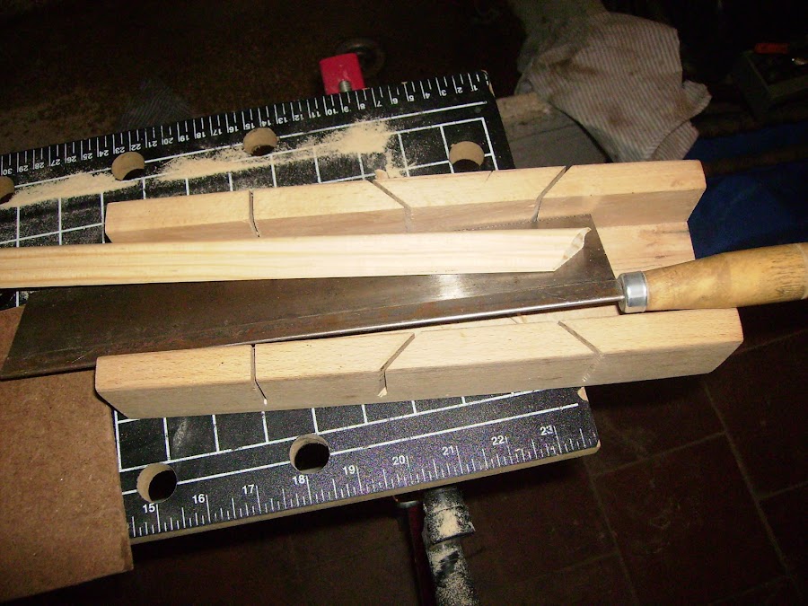 Con una ingletadora a mano voy cortando las molduras, con las que construiré las ventanas.