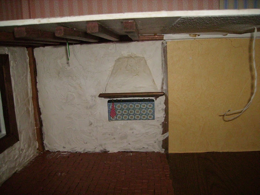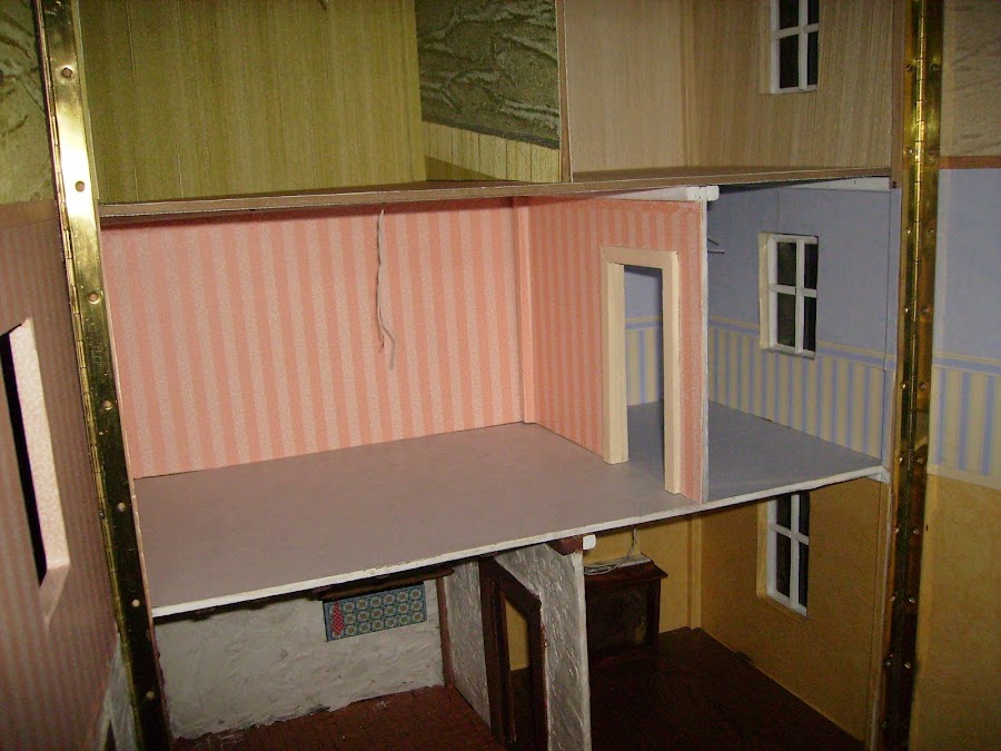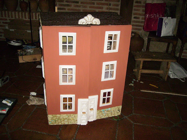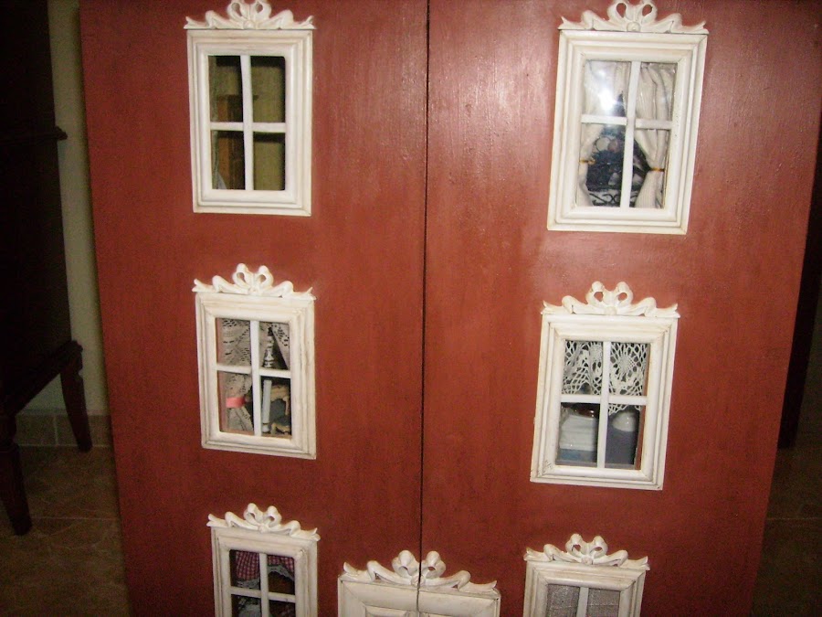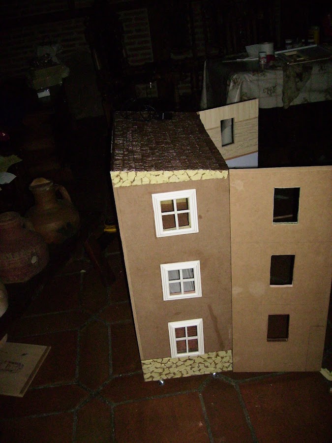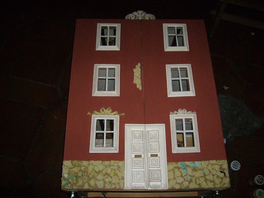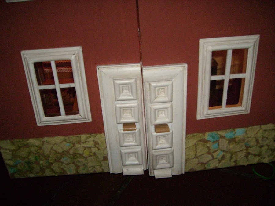 En esta foto la casa esta tumbada en el suelo, voy probando que molduras de resina, compradas la puedo poner para que decoren las molduras de las ventanas y de a puerta.