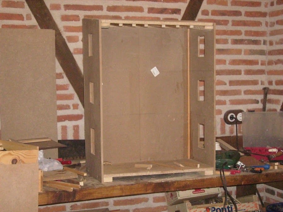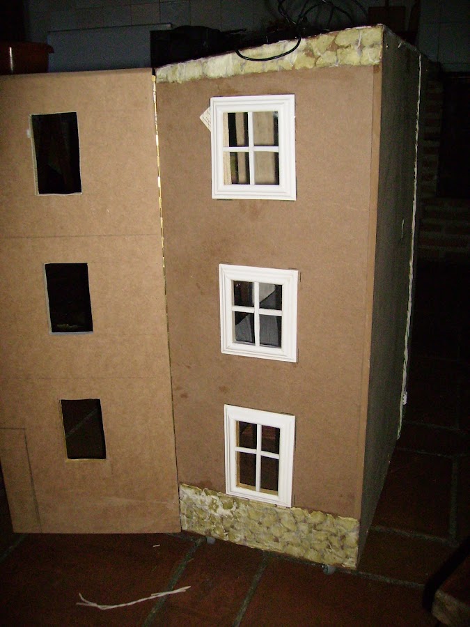 Con dm de 10mm, según se ve en la foto conformo la estructura de la casa, y hago los agujeros donde irán las ventanas.