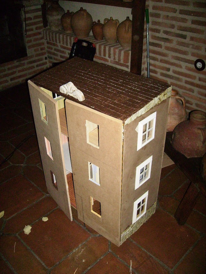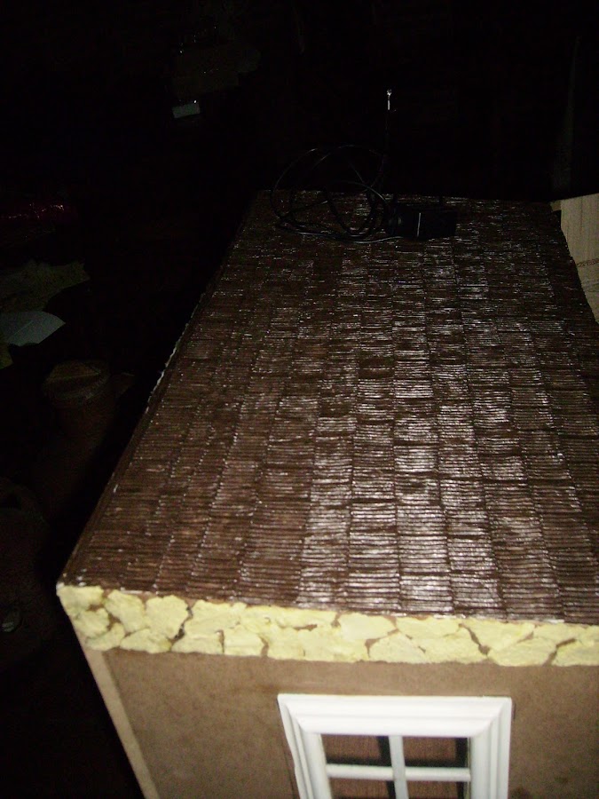 El tejado está construido, con el cartón del interior de las galletas de chocolate que es blanco y está ondulado. Yo lo corto trozo a trozo tratando de simular las tejas sobrepuestas, Y después lo pinto con pintura acrílica marrón, y para protegerlo una vez pintado le doy una mano de arkyl.