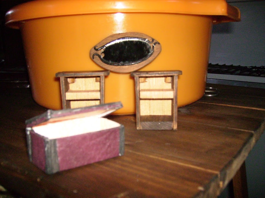 Detalle de las mesillas, el baúl y el espejo.(reciclado de una caja de maquillaje)
