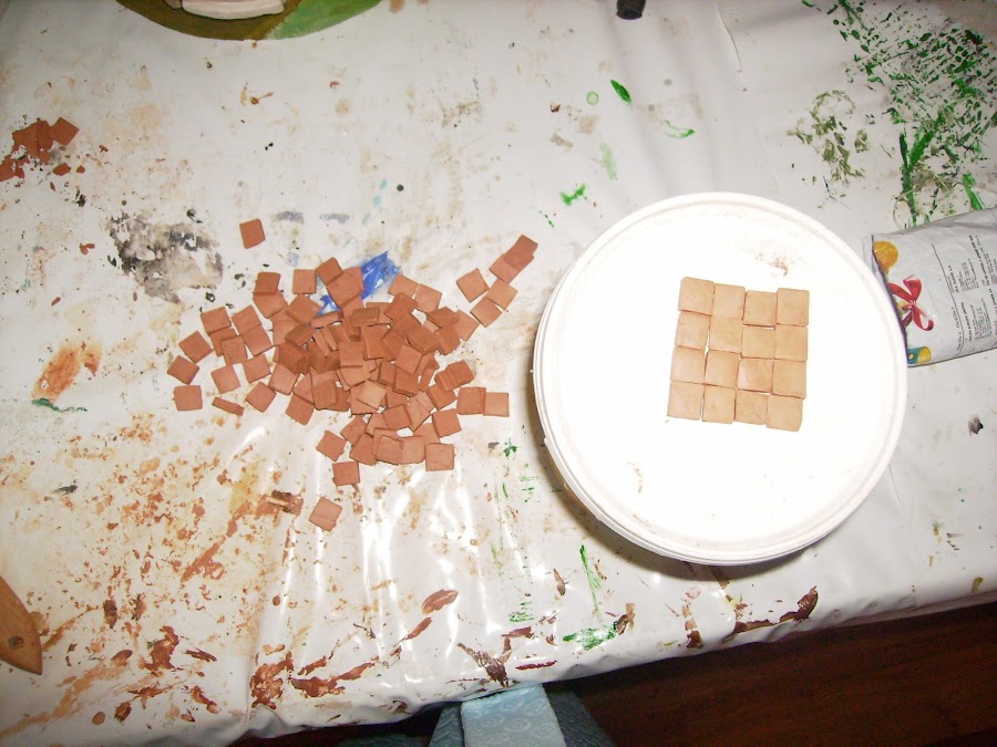 La que será la cocina rústica, hago cada baldosa de barro una a una con arcilla, y luego cuando estan secas las pego y las doy barniz.