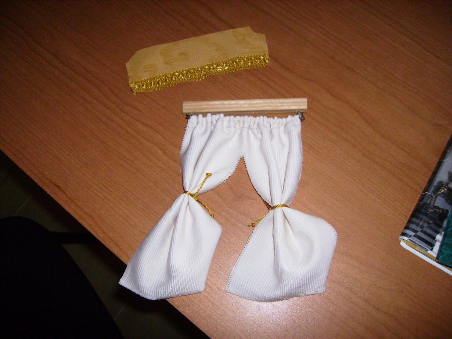 Mi madre me cose las cortinas, pero aquí se ve el sistema que les hago con unas argollas un alambre y una madera.