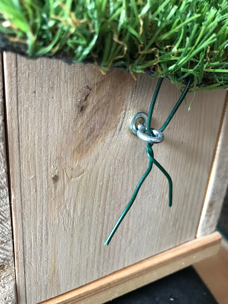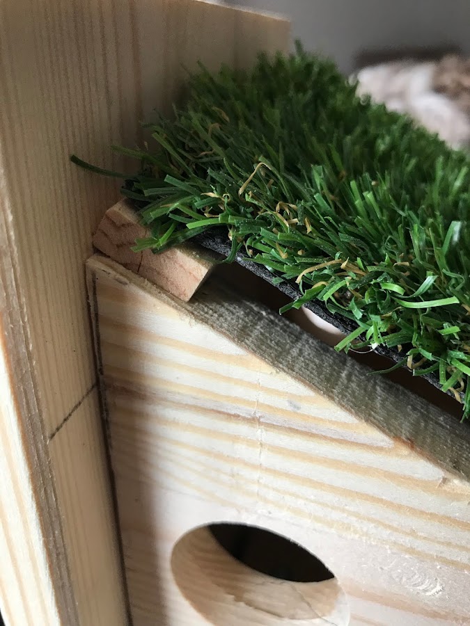 4. por último, coloqué el retazo de césped artifial que tenía. Únicamente esta clavado con tres clavos a un pequeño liston de madera en la parte de arriba.