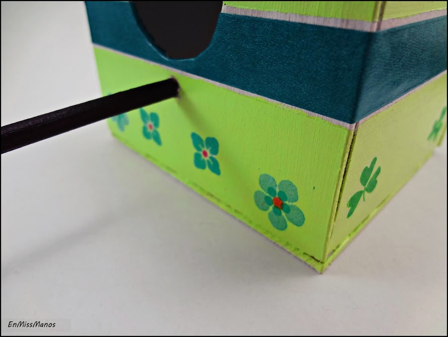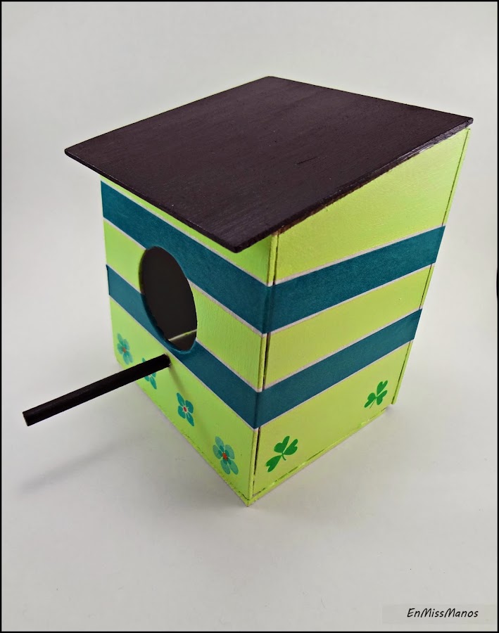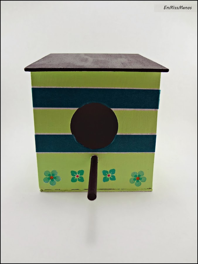 La pequeña la pinté de verde a rayas blancas con washi tape por encima, con el tejado marrón y con la misma servilleta de flores le puse algunas de tonos verdes con decoupage.