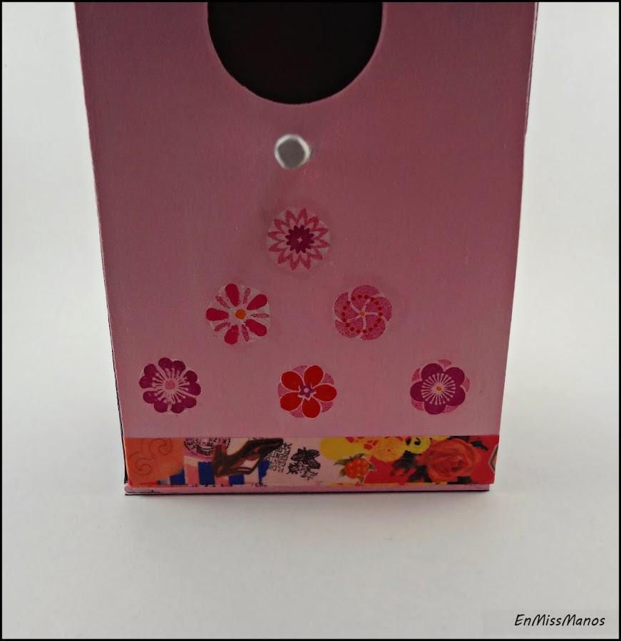 La grande la pinté de rosa, con un poco de washi tape en la parte de abajo y con decoupage le hice el tejado y las florecillas.