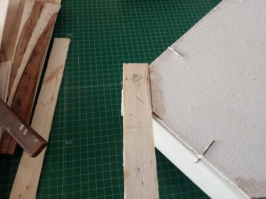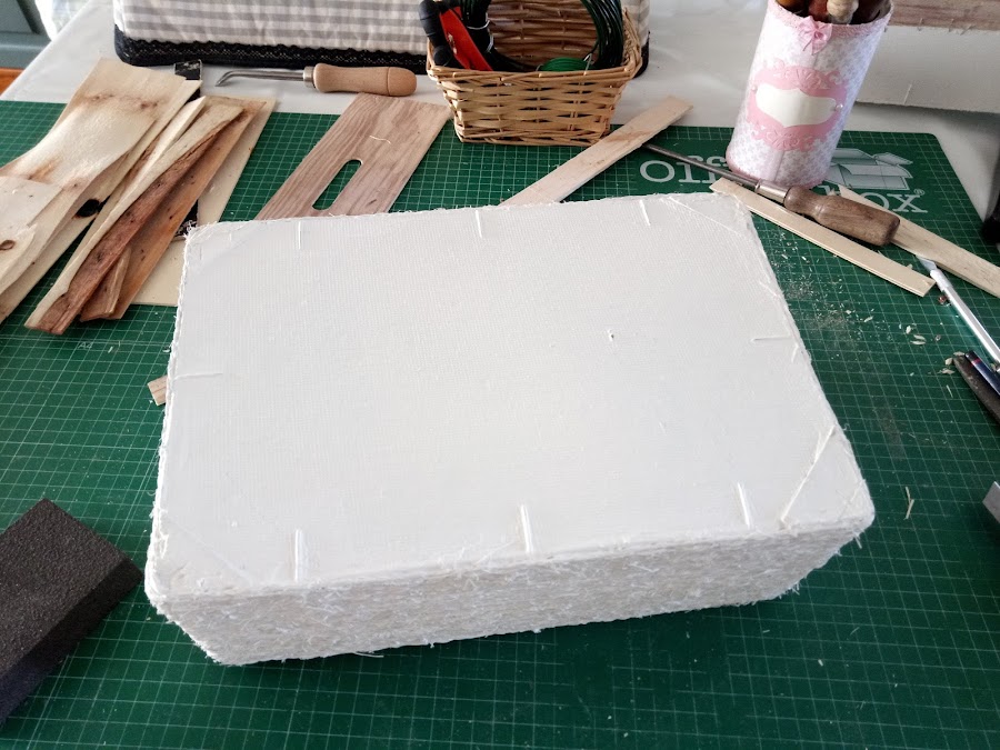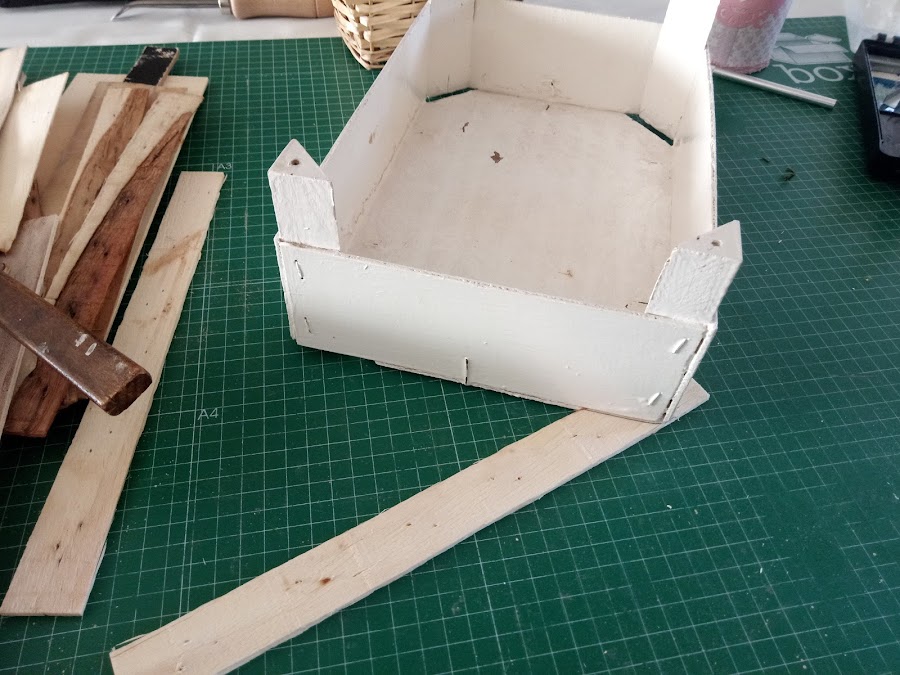 Con otro listoncito lo voy colocando en la parte del suelo de la cesta en las esquinas, que ya sabeis que les queda como una falta y así raso toda la superficie, porque si no quedarían raras las patitas al colocarlas, que yo personalmente, es lo ultimo que coloco
