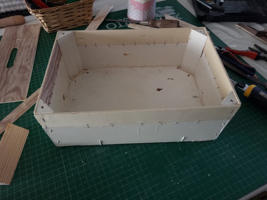 El proceso es facil, caja de fresas en este caso, y con restos de otra mas grande, melocotones, manzanas, da igual, yo siempre tengo para "repuestos" jajaja, pues de esas saco los laterales, los grapo a las esquinas para reforzar la cajita y ese paso ya esta¡¡