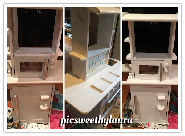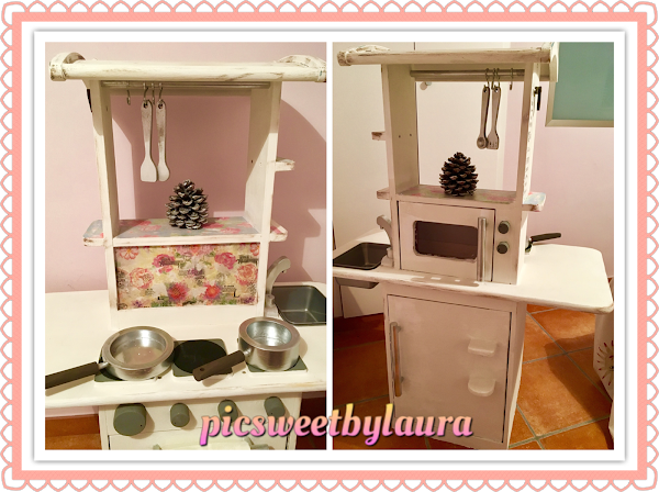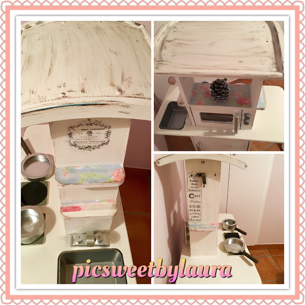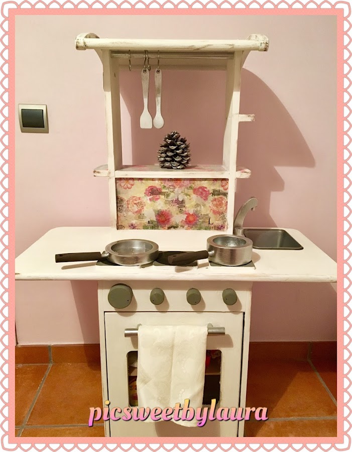 Por fin puedo hacer este post (¡bieeeeeeeeeeeennn!); me ha llevado mi tiempo hacer un "restyling" a esta cocinita de juguete que teníamos en casa. Me daba pena regalarla, tirarla y hasta venderla, así que se me ocurrió no hacer ninguna de las tres cosas, y darle un aire diferente. Ahora que está de moda lo vintage, lo retro y lo shabby pensé en pintar el mueble con pintura chalk y después aplicar varias técnicas aprendidas a lo largo de los tres/cuatro años que llevo haciendo manualidades.