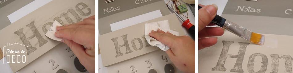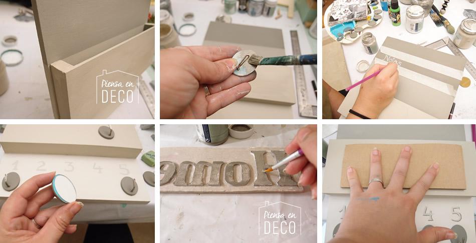 Vamos a decorar nuestro cuelgallaves con palabras y números. Yo los hice a mano alzada con un pincel, si no se te da bien puedes ayudarte de alguna plantilla de estarcir, o usar papel de calco para escribir, adhesivos, etc…