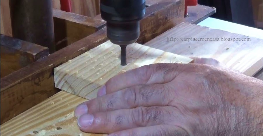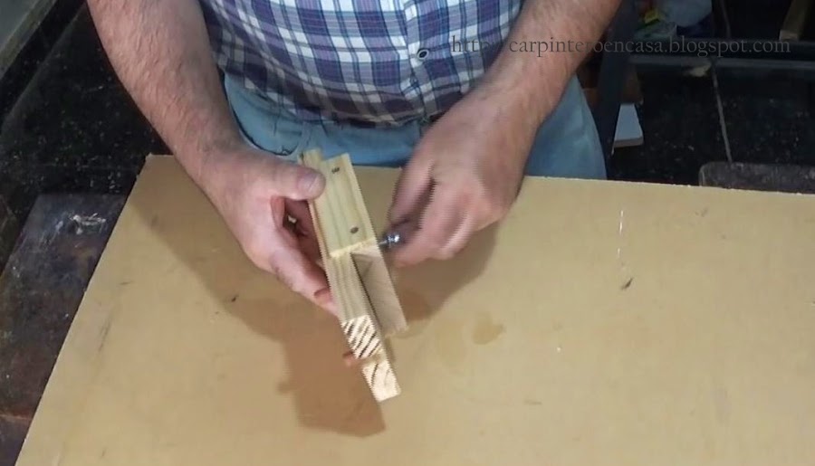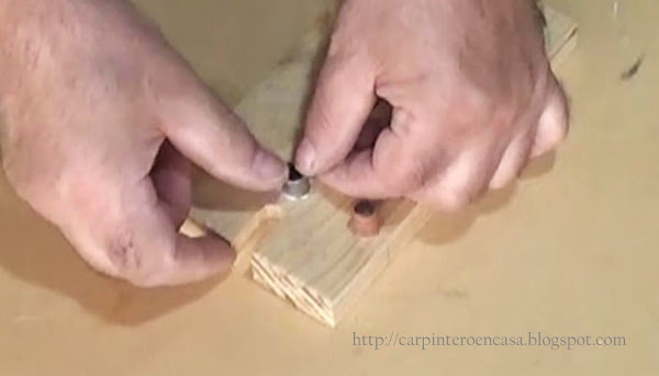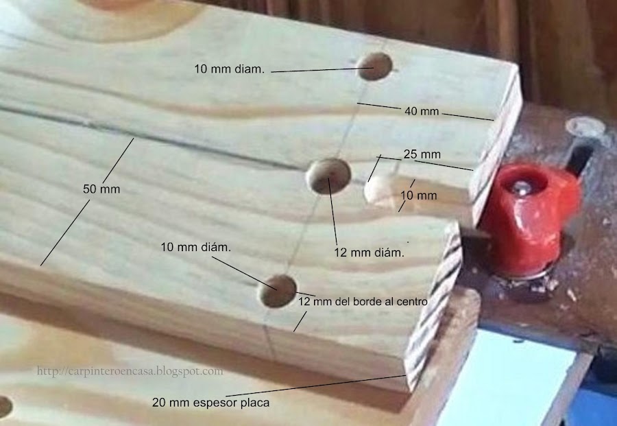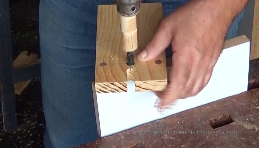 Colocamos la pieza grande, sin la pequeña, con los tarugos uno de cada cara de la placa haciendo tope, y con el borde lateral junto al vértice de la misma, y perforamos en el centro con una mecha de 10 mm. Repetimos la operación, a modo de espejo, a ambos lados de la placa. Usaremos un tope en la mecha. Debe ingresar a el canto una perforación de 25 mm más o menos, para que nos quede perforar 15 mm en la cara de la otra placa, en el extremo. Los tarugos son de 40 mm de largo.