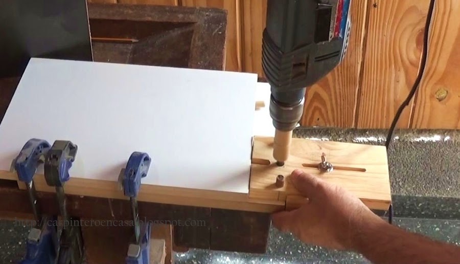 A continuación ubicamos la primera placa con los tarugos sobre la segunda placa a perforar. y colocando el dispositivo haciendo tope en la cabeza, con la ranura cubriendo el tarugo, perforamos. La profundidad ideal de la perforación, en este paso, debe ser 2 mm menor que el espesor de la placa.