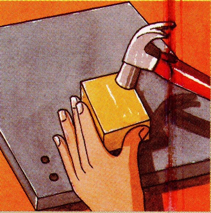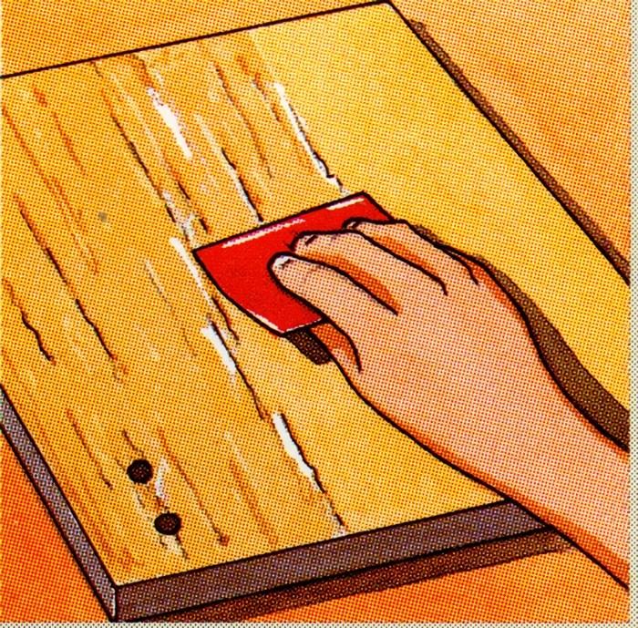 Refuerce la unión golpeado con un martillo; puede proteger el enchapado con una toalla, pero no será necesario si va con cuidado. Golpéela, interponiendo un taco de madera entre ella y el martillo. Así fortalecerá la acción de la cola. Si quedan restos de adhesivo, elimínelos con un paño húmedo en acetona. Un truco