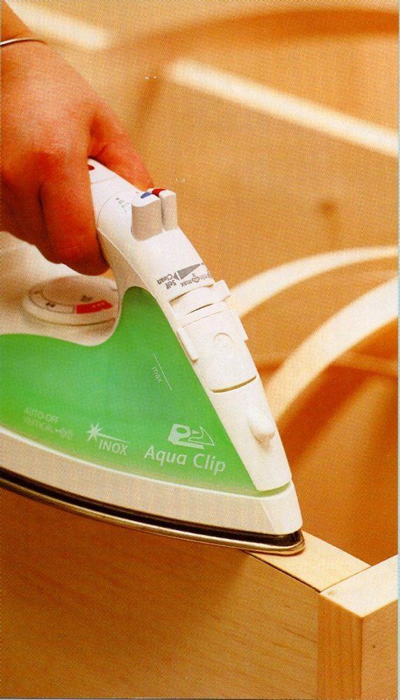 Si tiene que recomponer una puerta de armario-como la de la parte superior-, una estantería o unos cajones, es muy probable que también tenga que encargarse de sustituir los cantos viejos y deteriorados por unos nuevos. No se complique la vida, ya que la cola de contacto no es una buena solución para reparar superficies pequeñas. Los más útil y prácticos es adquirir unos bordes o láminas pre-encoladas, que se pegan fácilmente mediante la aplicación de una fuente de calor. Como se ve en la imagen, podrá pegarla a la perfección con la plancha.