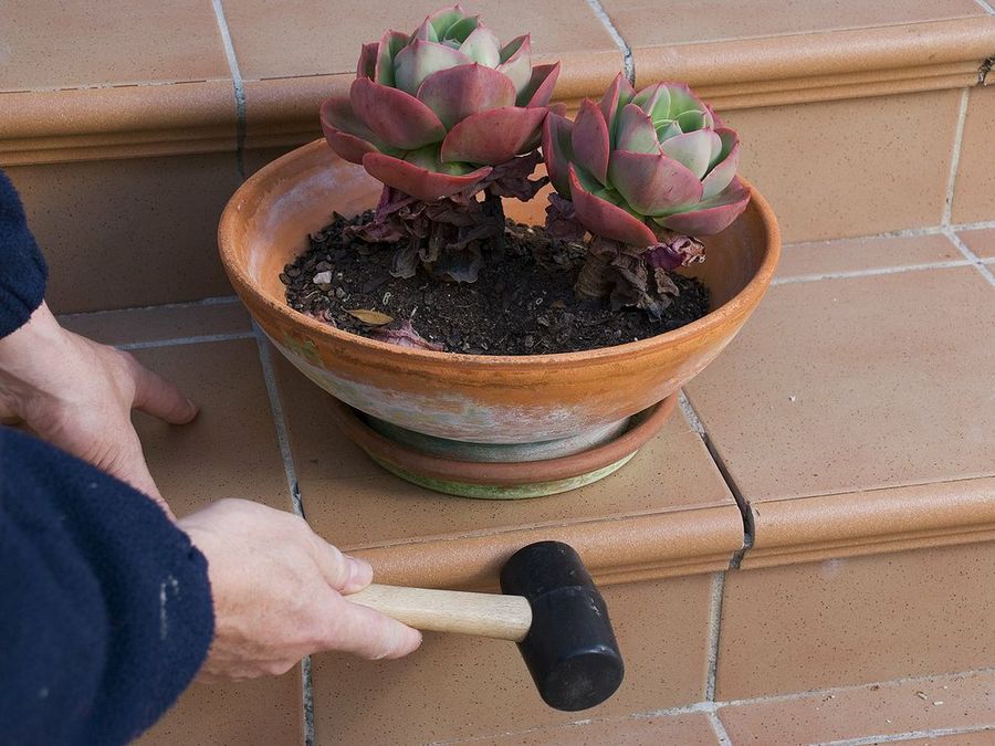 El martillo de goma es el utensilio usado en albañilería para ajustar las piezas, dada su fragilidad. Los cordones de adhesivo harán necesario un cuidadoso montaje. Con la práctica aprenderemos a extender la cantidad adecuada para rellenar todos los huecos sin que el espesor de la capa de adhesivo dificulte el ajuste de la pieza rota.
