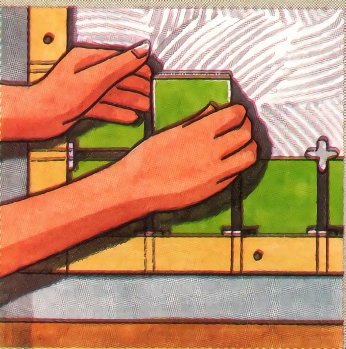 Utilizando los espaciadores (que pueden ser crucetas o palillos), vaya añadiendo azulejos.
