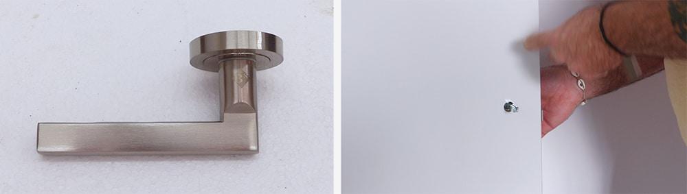 En el siguiente paso colocaré la manilla. Ponemos una por un lado de la puerta introduciendo el cuadradillo por el agujero de la cerradura y después situamos la otra manilla por el otro lado de la puerta.