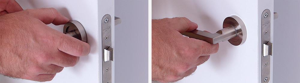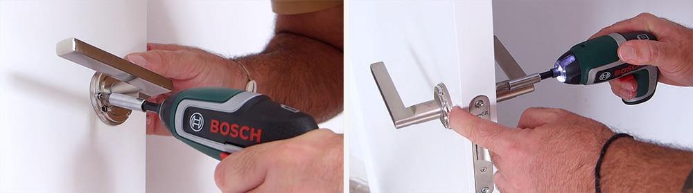 Las fijamos a la puerta mediante los tornillos que trae. Gracias a la extensión de la punta del atornillador atornillamos la manilla cómodamente.