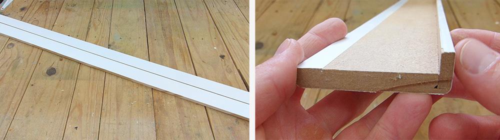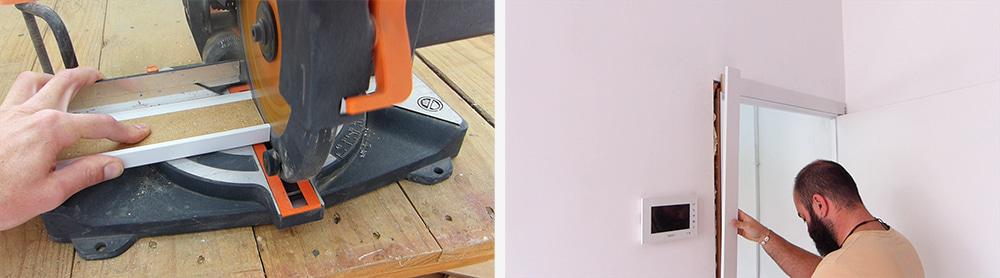 Tras cortarlos a la medida de mi puerta con la ayuda de una ingletadora eléctrica los pegó al tabique con adhesivo de montaje.