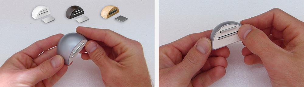 Aquí te lo muestro. El mío es de color cromado mate pero lo tienes también en color blanco, marrón y tono madera. Tiene unos imanes que actuan a modo de retendor de la puerta para que no se cierre inesperadamente.