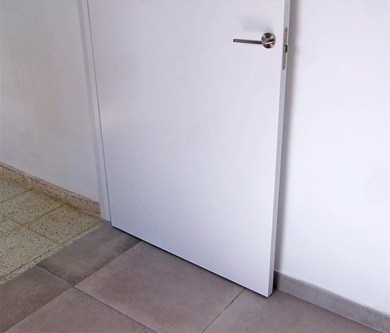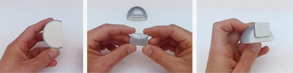 Tras haberlo enrasado en su parte inferior con el imán del retenedor lo colocamos en el suelo, establecemos su posición, limpiamos el suelo con un trapo con alcohol, retiramos el plástico protector del adhesivo y pegamos el retendor al suelo. Después quitamos también el plástico protector del adehsivo del imán y llevamos la puerta hastá el, presionaos con la mano para fijar la puerta al imán y ya lo tendríamos instalado.