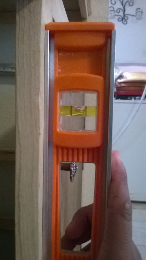 2. Primero colocamos el bastidor horizontal superior para establecer la altura y el ancho y alto del mueble, a partir de ahí nos vamos hacia abajo e ir progresando pieza por pieza. El bastidor debe quedar tan cuadrado y nivelado como la misma construcción lo permita, especialmente nivelado, ya que el resto de la construcción dependerá mucho de esta pieza