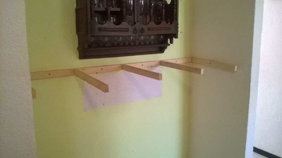 1. Tras obtener las medidas, se debe trazar en papel el diagrama y plan de trabajo, nos basamos en un bastidor hecho a medida para aprovechar el máximo espacio posible. Este bastidor está fabricado de listones y reforzado con tornillos contra la pared de bloc de concreto y tornillos entre sí para darle resistencia.